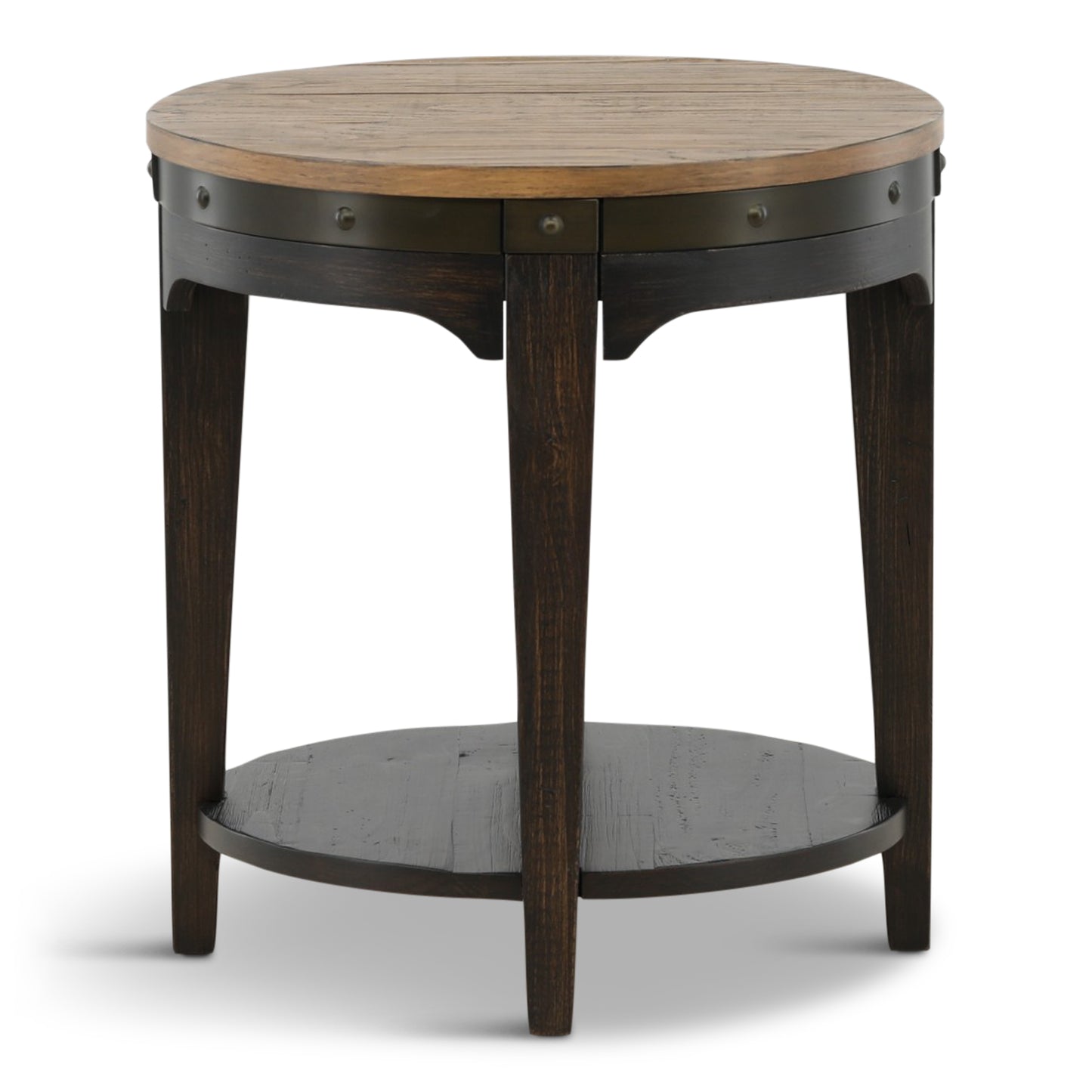 Add some natural texture and cozy character to any space with this rustic industrial end table. The natural grain of the pine shines through our soft finishes, pairing with a band of heavy metal nail heads for the look of a vintage, flea market find. The end table includes one shelf for storage and display.