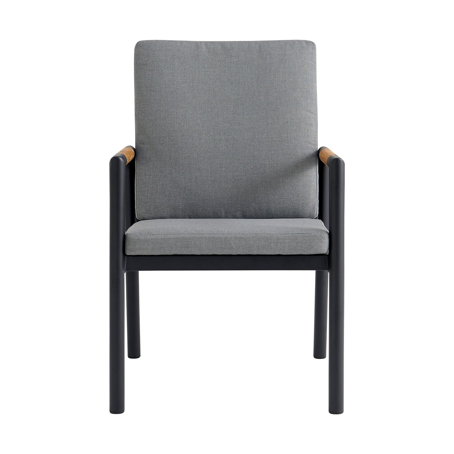 The Royal black aluminum and natural teak outdoor dining chair with dark gray fabric features a chic durable and lightweight aluminum frame complete with warm teak accents on the arms. The Royal outdoor dining chairs come in a set of 2 and are available in your choice of a black frame with dark gray cushions or a white frame with light gray cushions. The UV and water-resistant cushions are ideal for any home and conveniently feature a zipper closure, making clean up a breeze. This combination is timeless, and its modern look is sure to please for many seasons and years to come.