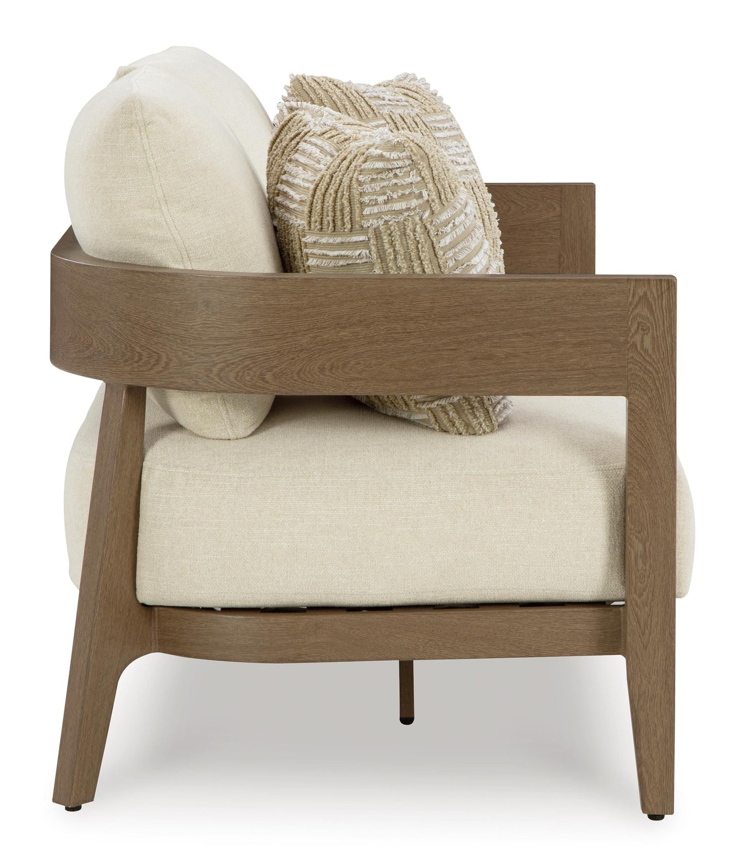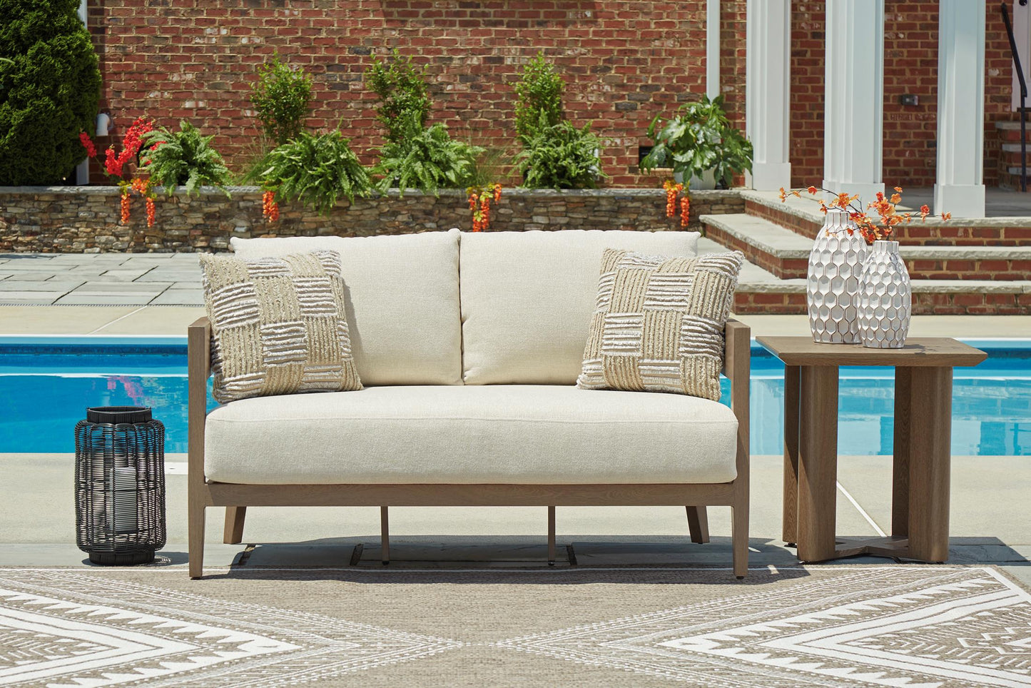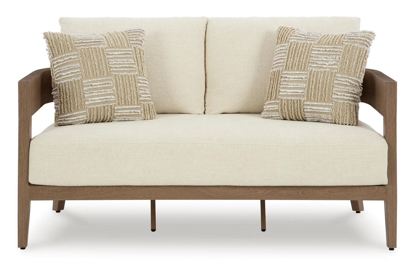Elevate the appeal of easy-breezy living with this outdoor loveseat. Made to look like wood yet durable enough to weather the elements, it's sure to serve you and your besties well, year after year. The gently curved piece features cushions wrapped in Nuvella+â„¢ high-performance fabric for plush refinement. Patterned accent pillows infuse delightful texture.