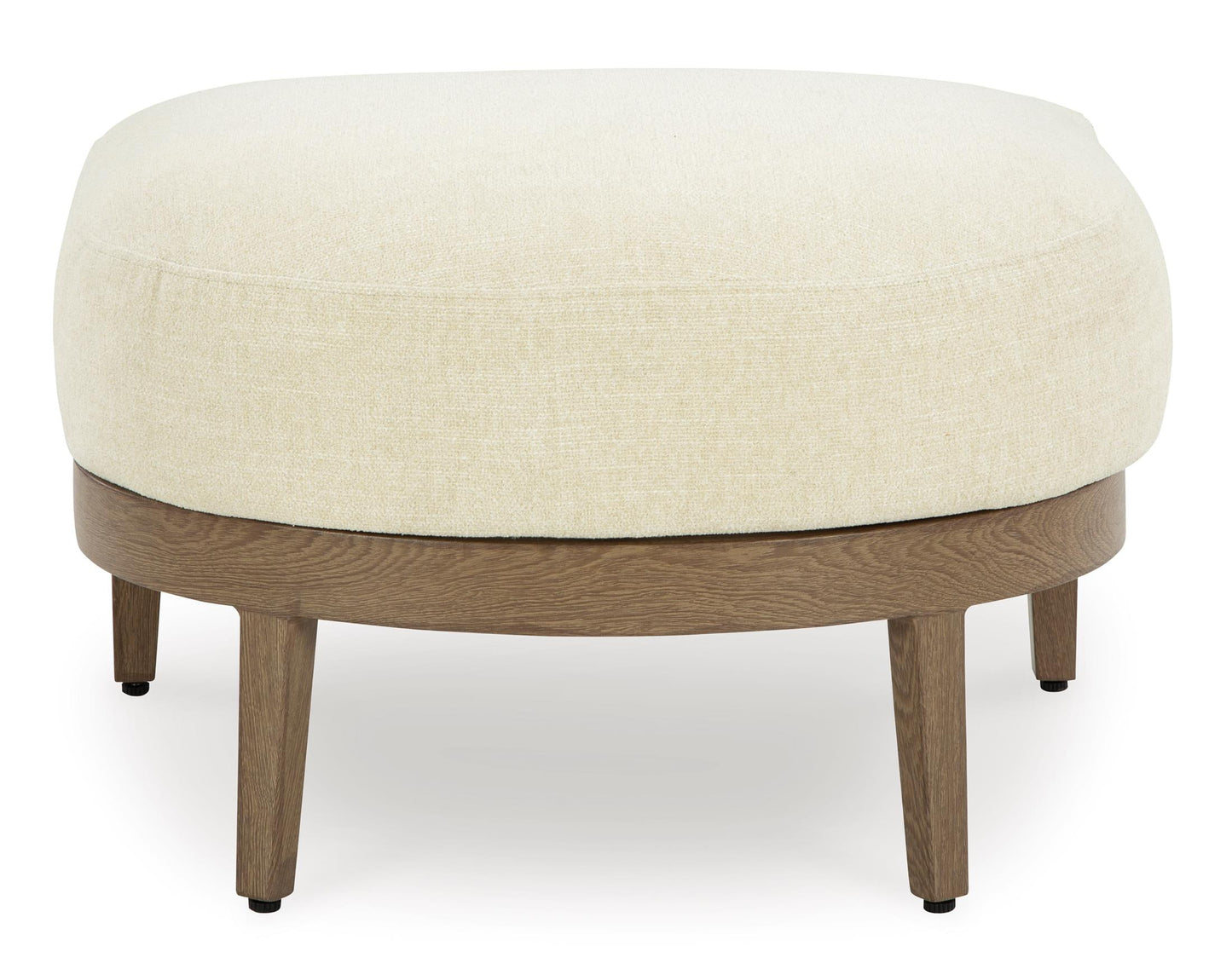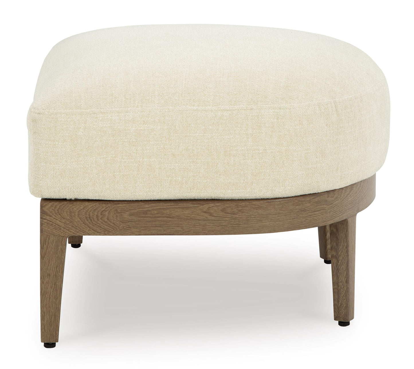 Elevate the appeal of easy-breezy living with this outdoor ottoman. Made to look like wood yet durable enough to weather the elements, it's sure to serve you and your besties well, year after year. The gentle curve of the frame is echoed in the cushion, which is covered in Nuvella+â„¢ high-performance fabric. Talk about plush refinement.