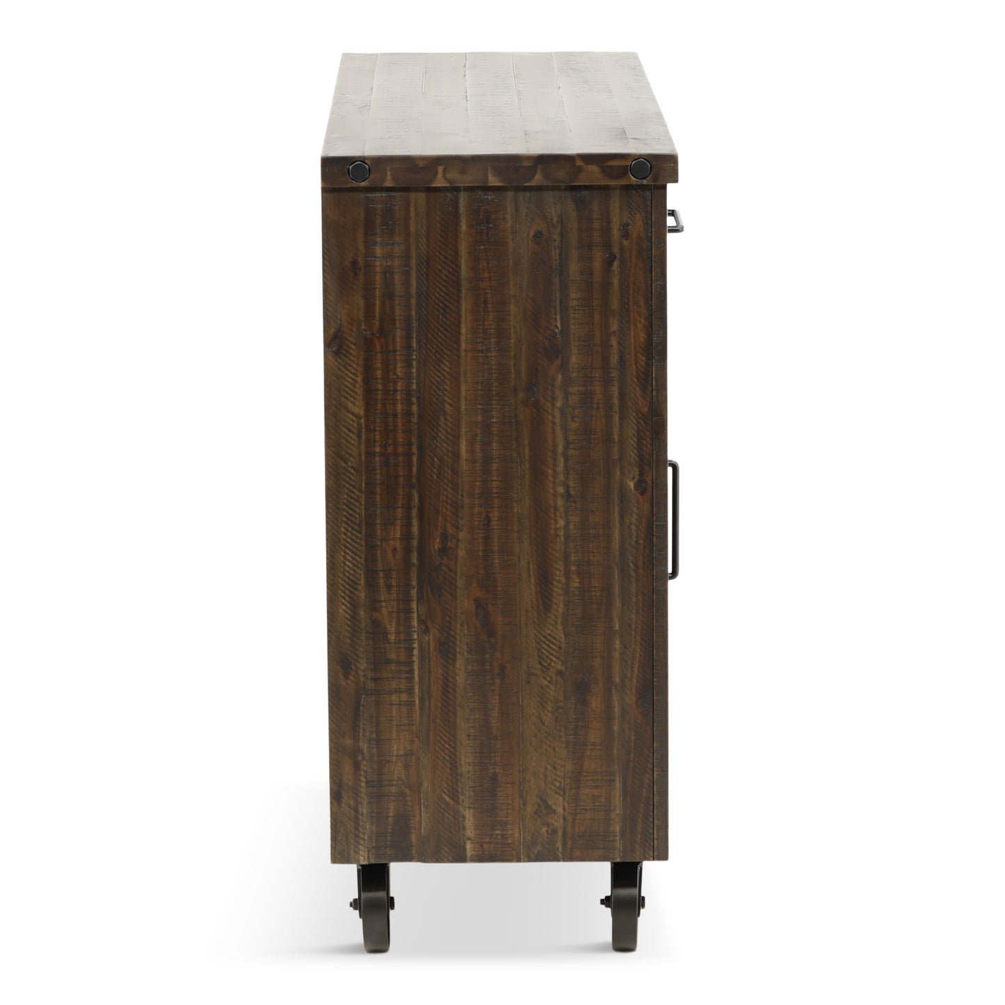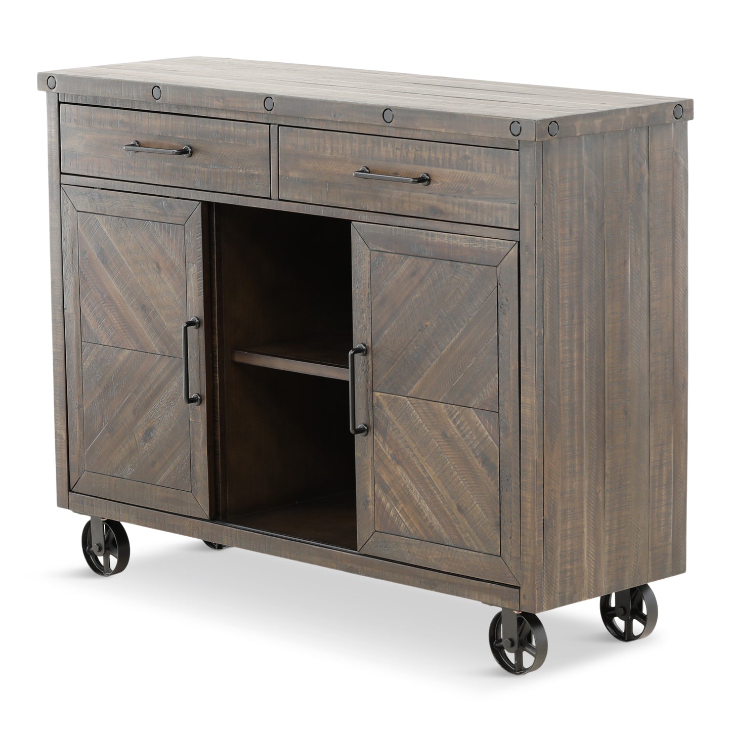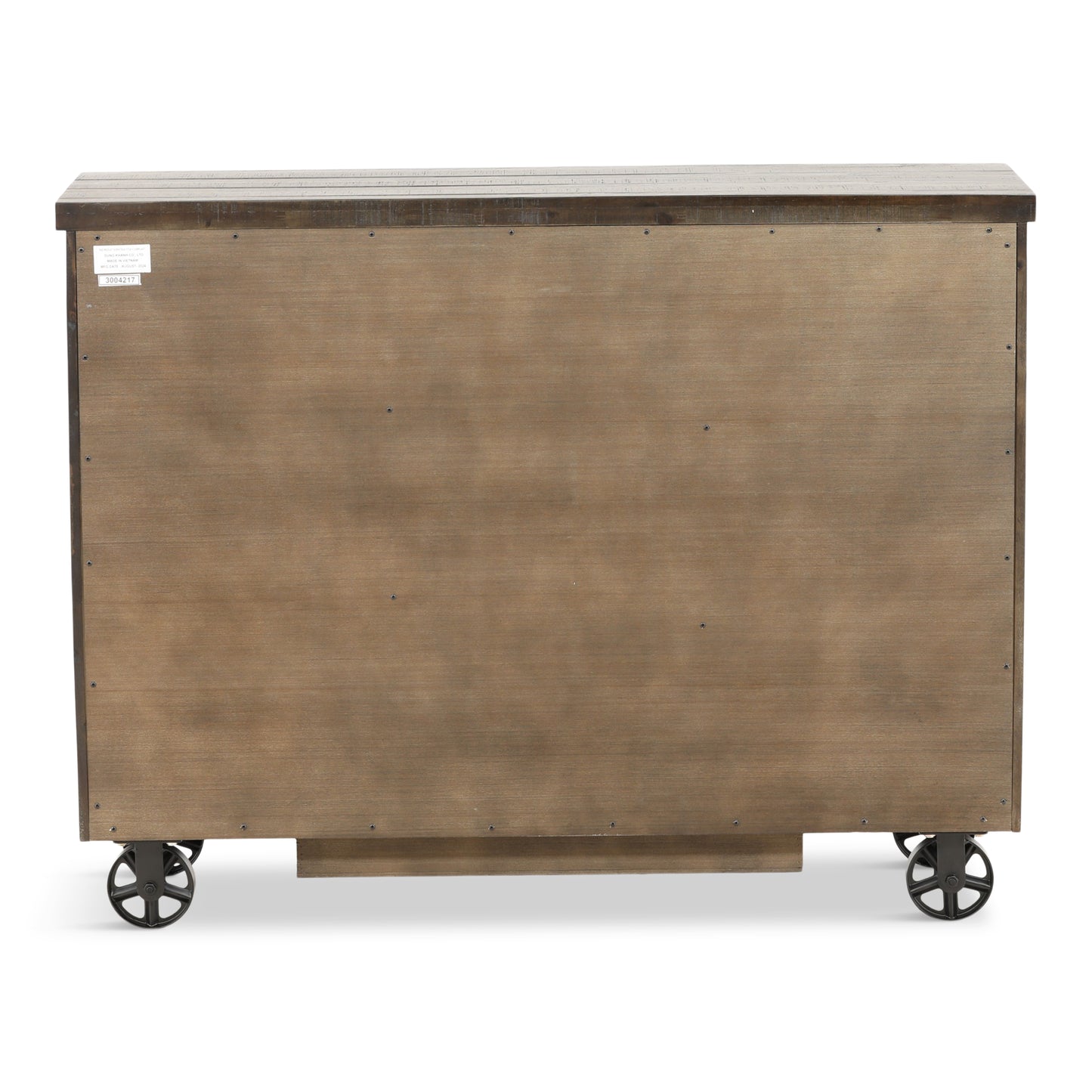The Solomon counter height dining collection, brings boldness to a casual dining scheme. With a trestle base design and a deep finish, this everyday counter height table serves as a perfect gathering space. Enjoy an attractive chevron design on its table top while accommodating deep chairs and extra storage. The inventive table design creates options for positioning to suit your needs. The slat back design of the chair and the black hardware finishes, reflect a design-forward blend of modern and farmhouse concept.