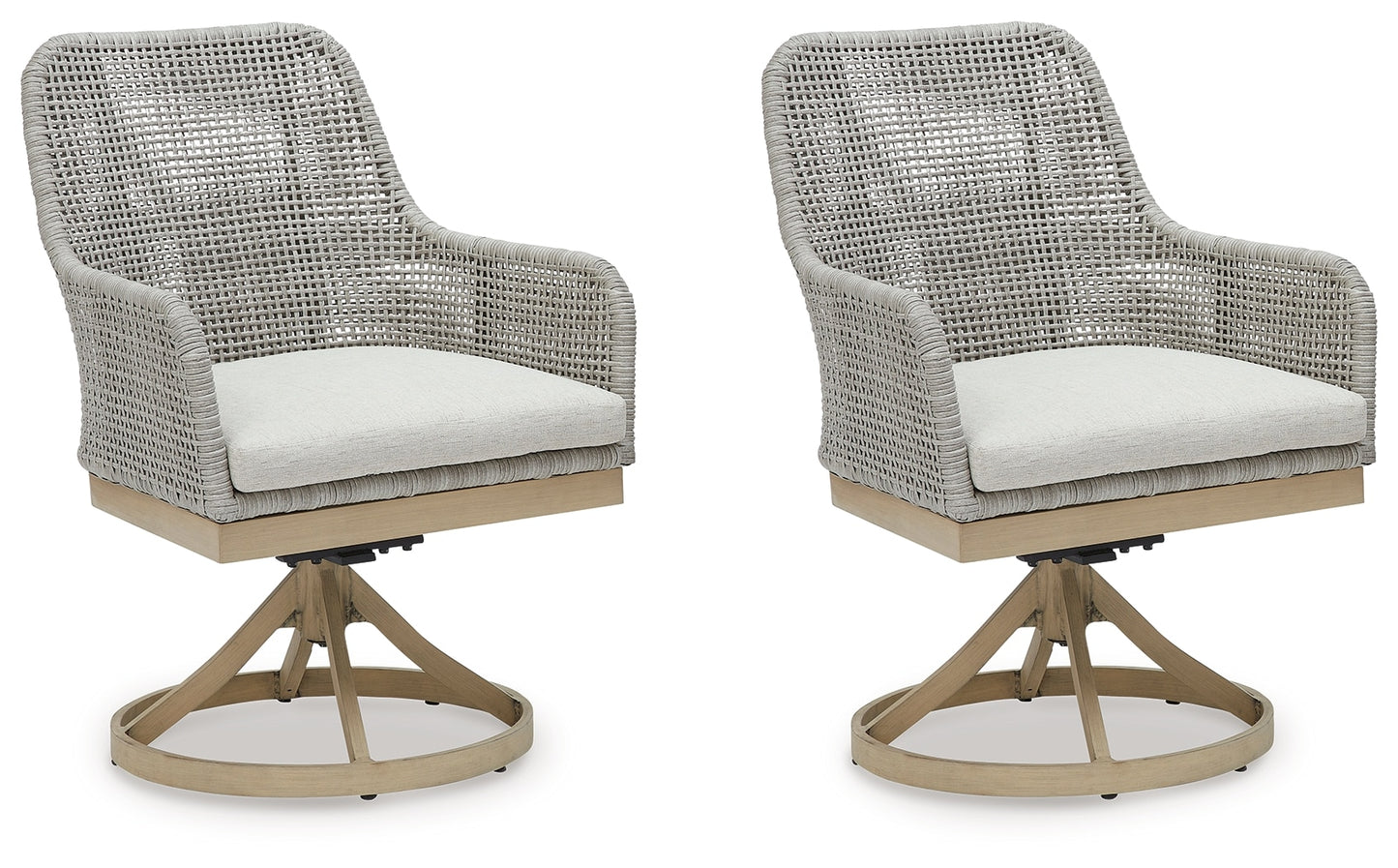 This swivel dining chair invites your casual contemporary style outdoors. With its resin wicker in a chic neutral hue, it expertly marries refined design with durability. Its 360-degree swivel makes it easy to switch from watching the kids at the pool to grabbing a drink from the table. And breezy summer mornings and cold winter nights are made all the more comfortable with high-performance Nuvella+™ fabric covering the seat cushion.