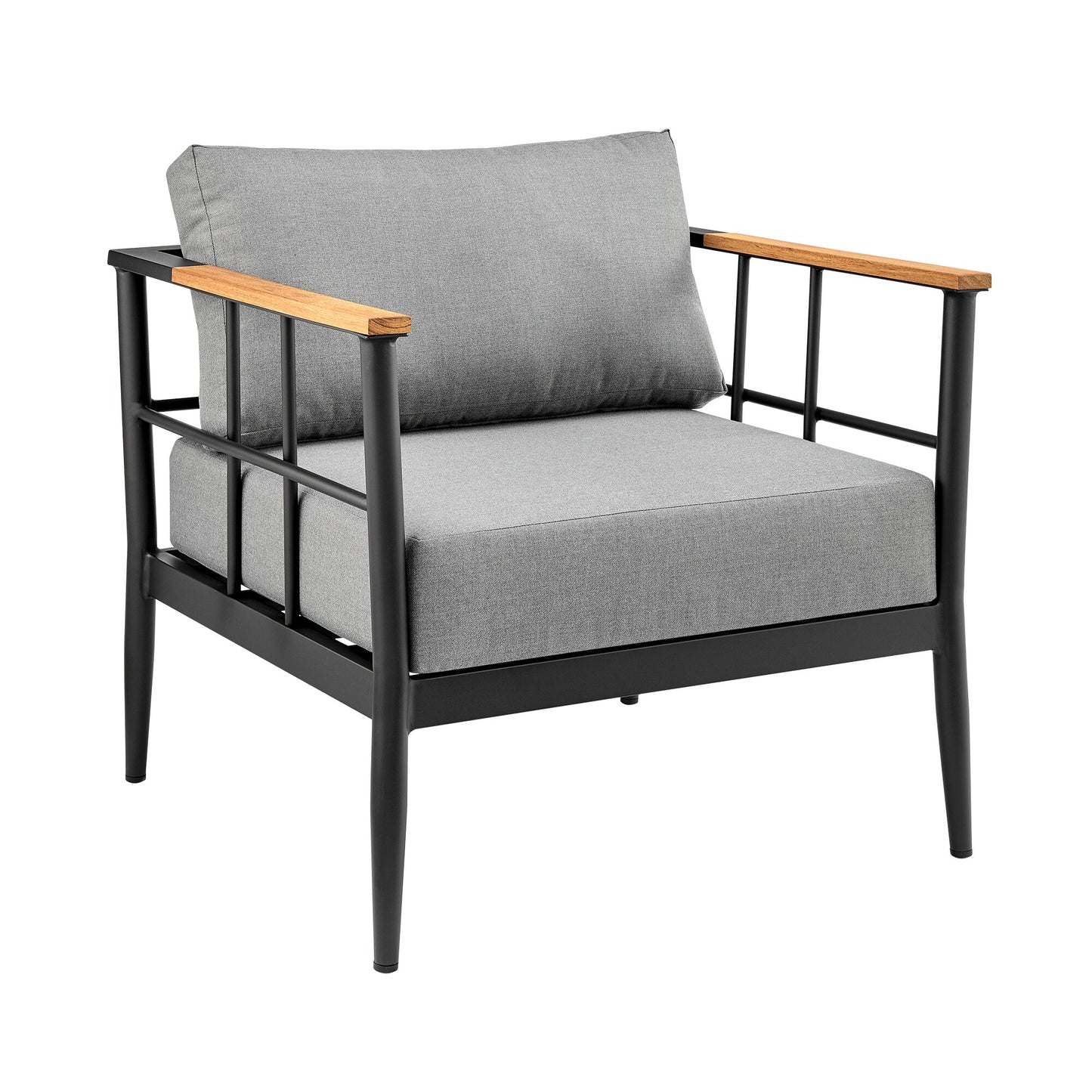 Your outdoor space is instantly elevated with the Shari Outdoor 4-piece set by Armen Living! This patio conversation set includes 2 lounge chairs, 1 sofa, and 1 rectangular coffee table. The outdoor patio chairs and sofa with cushions have removable cushions and feature a zipper closure, making clean up a breeze! The chic aluminum table, chair, and sofa frames feature a multi-layer powder coating for effective protection from the weather, everyday wear, and tear. The slat style tabletop helps elements to easily pass through which adds to its durability. The Shari 4-piece outdoor set is available in a black finish with dark gray cushions and natural teak wood accents. Aluminum is a light and rust proof material and can be moved from your backyard, to your screened in porch, to your garden with ease! The modern, clean line silhouette which is complimented further by the beautiful teak wood arm accents and the geometric barrel style back.