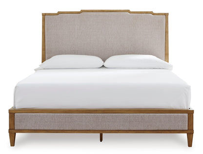 Taking a timeless approach to bedroom beauty, this queen upholstered bed brings easygoing elegance to the everyday. Softly upholstered in a neutral hue, it seamlessly slips into your room’s aesthetic. Adding to its fresh approach to transitional stylings: a chic wood frame and staggered detailing on the headboard.