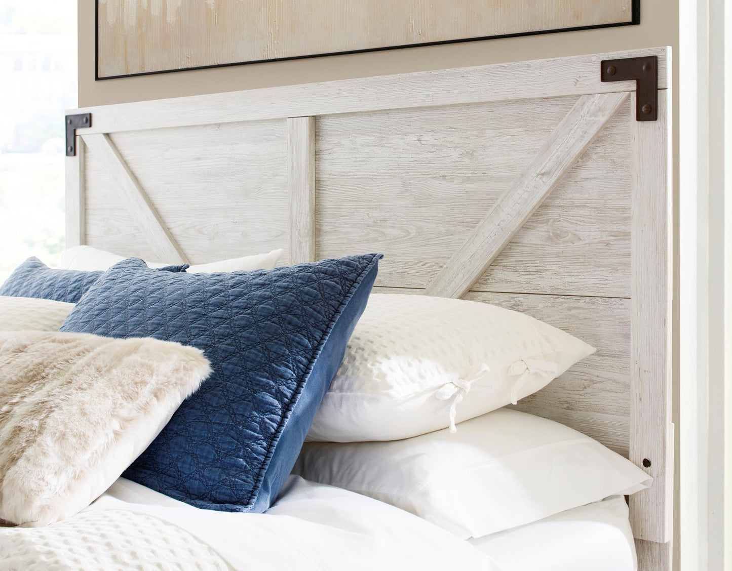 Give provincial a new meaning with the chic look of the Shawburn full panel headboard. The white wash distressed finish keeps this piece light and fresh while the warm pewter-tone hardware adds an industrial touch. The panel headboard with crossbuck detail adds a delightfully homespun charm to your space.