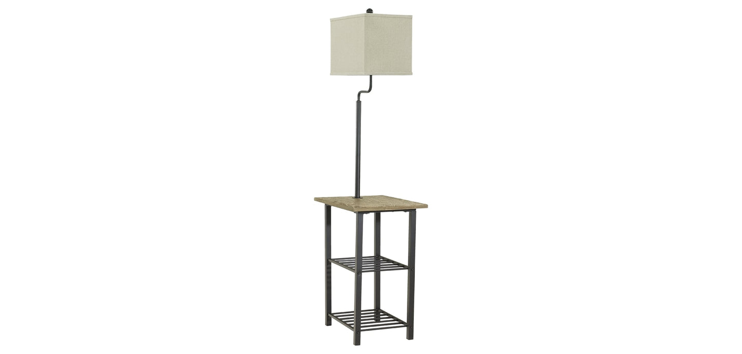 This metal tray lamp seamlessly integrates tabletop and dual rack space with an overhead lamp, putting multifunctional furnishings in a new light. What an especially bright idea when you're tight on space.