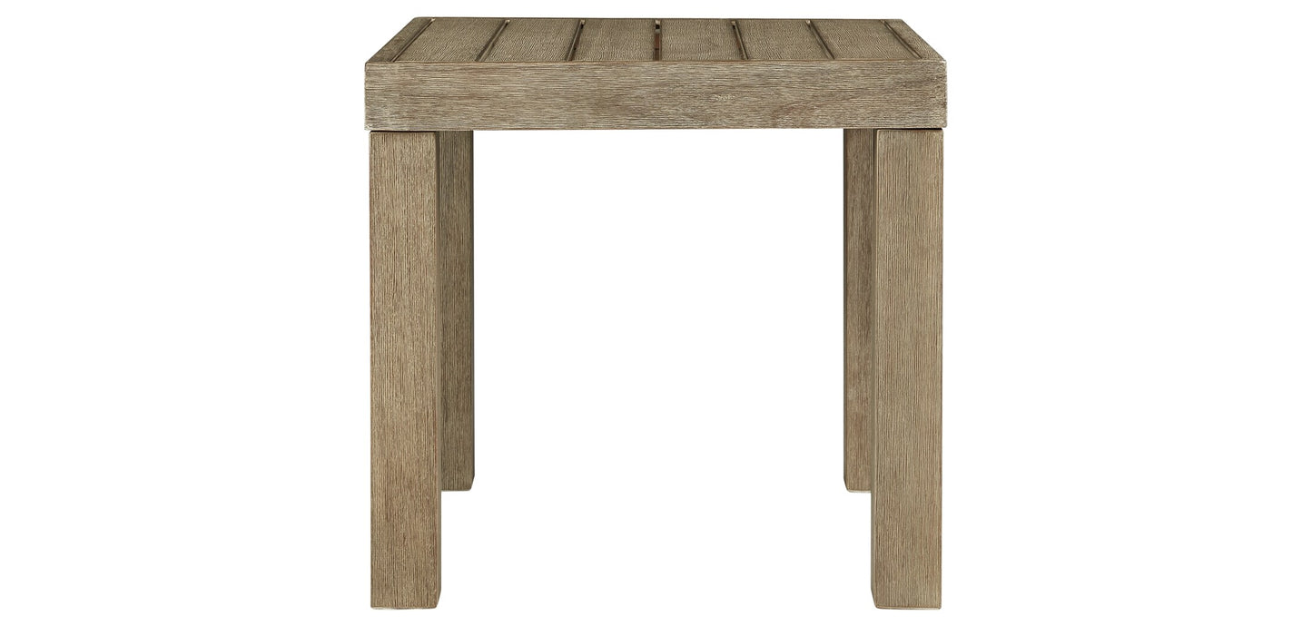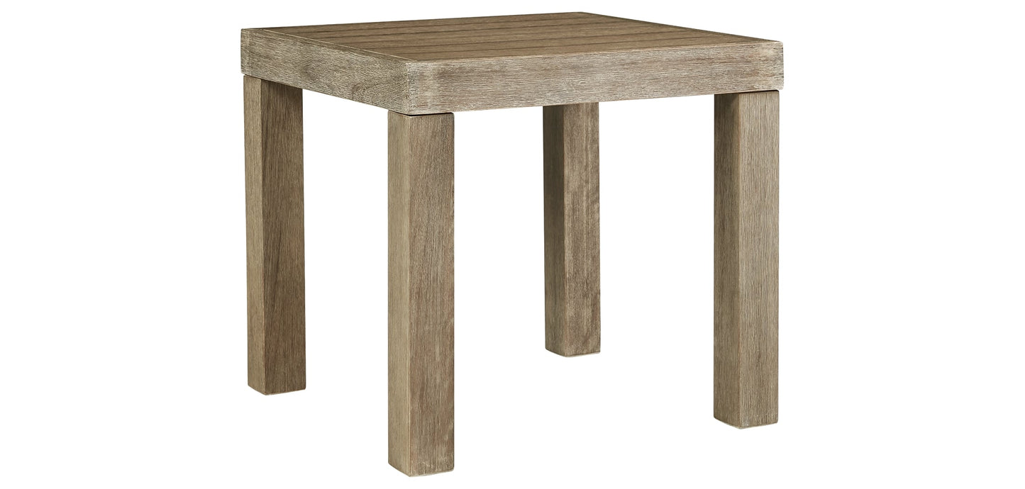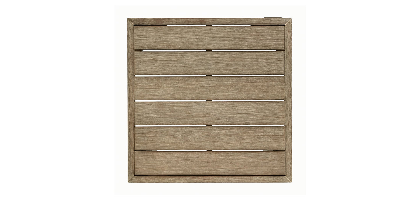 Beautifully on point, this outdoor end table is the natural choice for modern minimalists who know that less is more. Quality crafted of eucalyptus wood, this ultra clean-lined outdoor table is enriched with a multi-step embossed finish that both brings out the wood’s natural grain and protects it from the elements for seasons of fun in the sun. Incorporating form and function, the plank top naturally sheds rainwater.