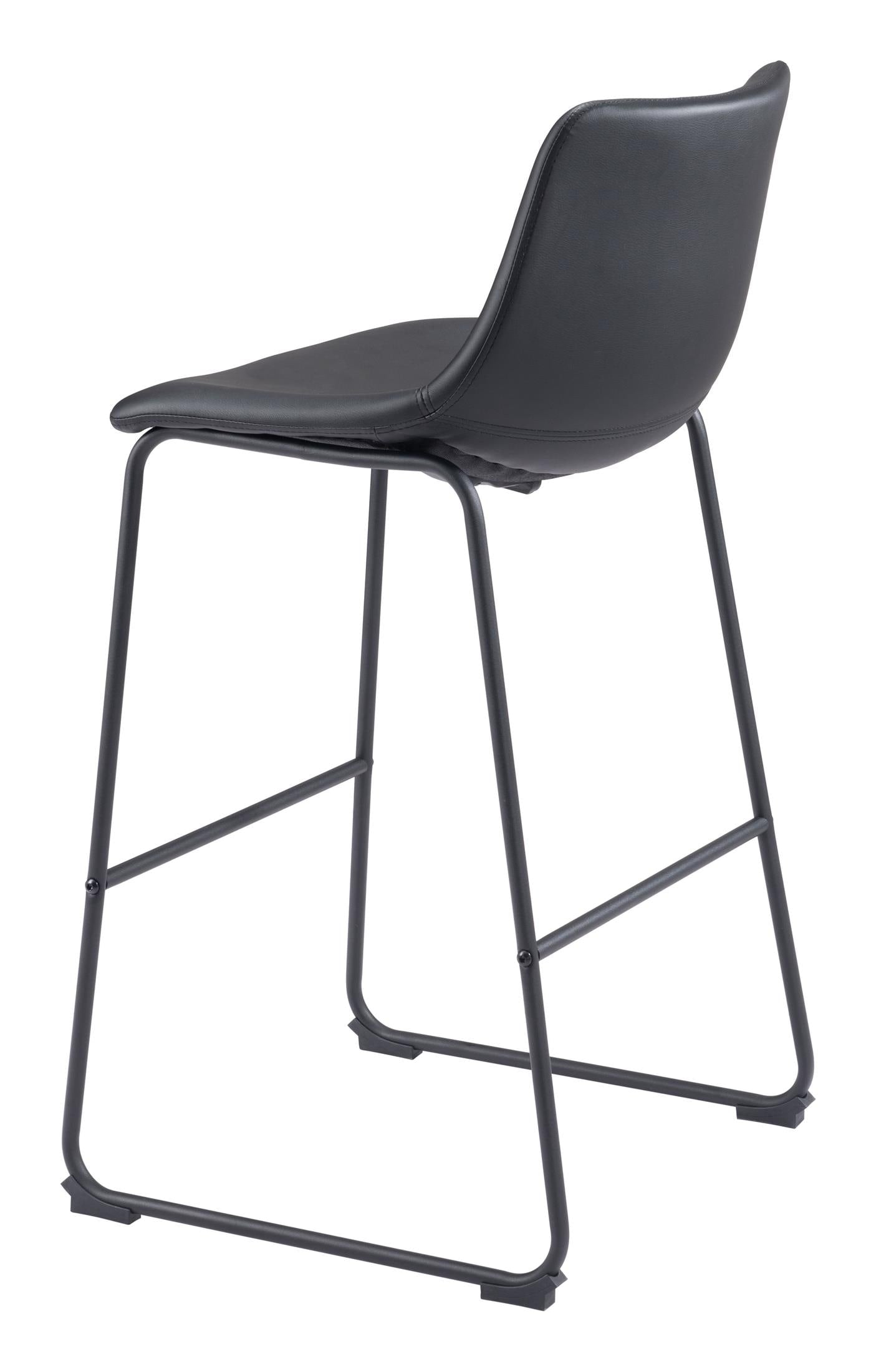This barstool's seat and back are built with a sculpted design for comfort, It's upholstered in a soft 100% Polyurethane fabric, with a slim profile metal base and two crossbars for stability. The frame is finished in matte black, for a universal appeal.