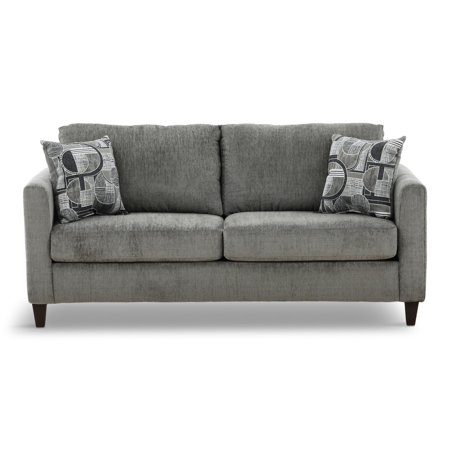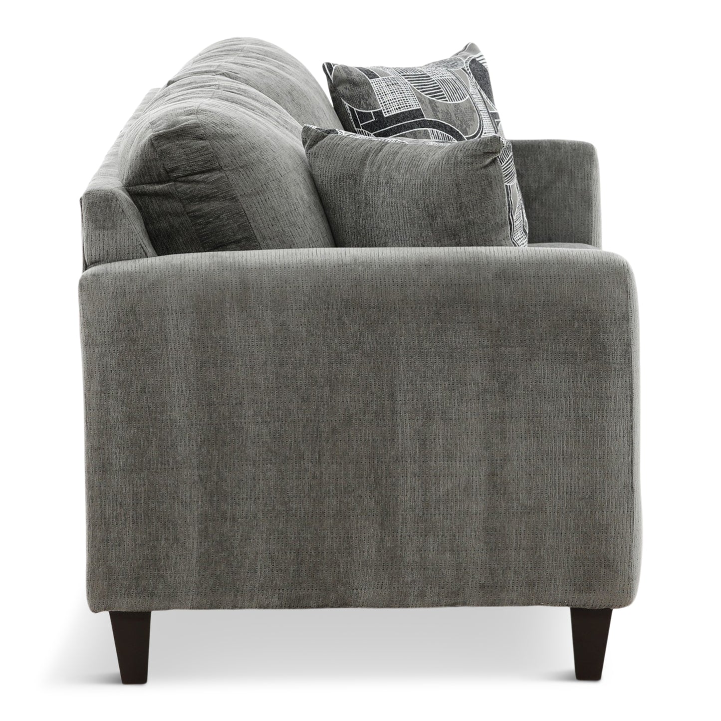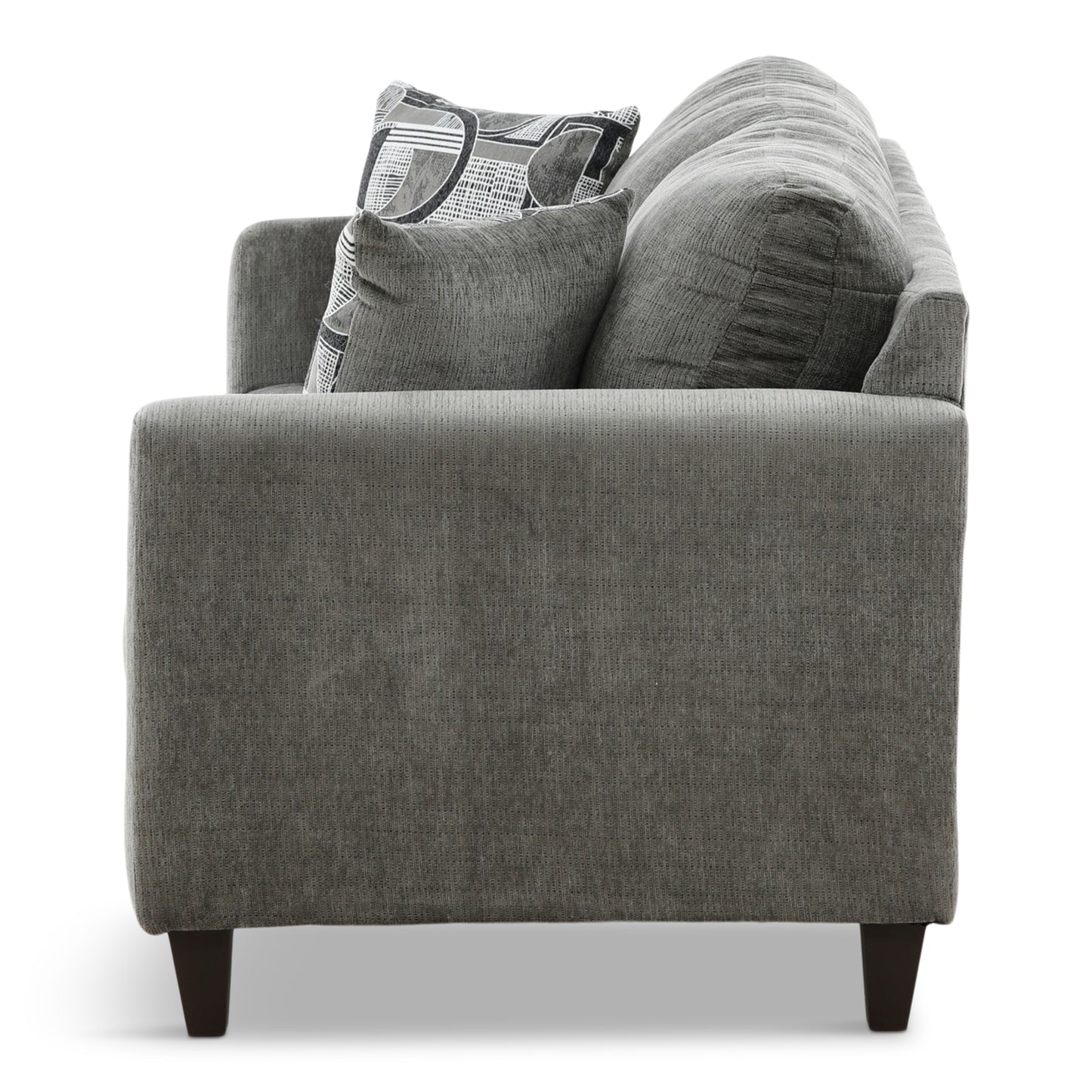 Attractive apartment sized, tuxedo arm, two over two contemporary group with full sized seating. All in a soft, durable charcoal colored chenille with stylish woven jacquard geometric accent pillows on the sofa and loveseat. Matching chair and chaise rocker recliner upholstered in charcoal base cloth.