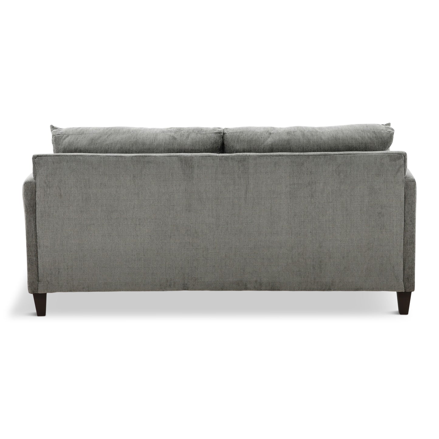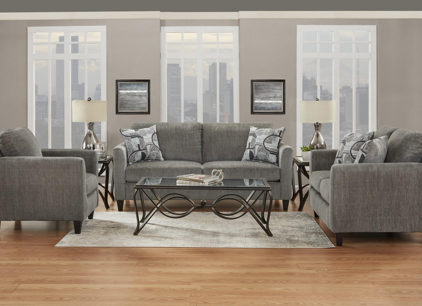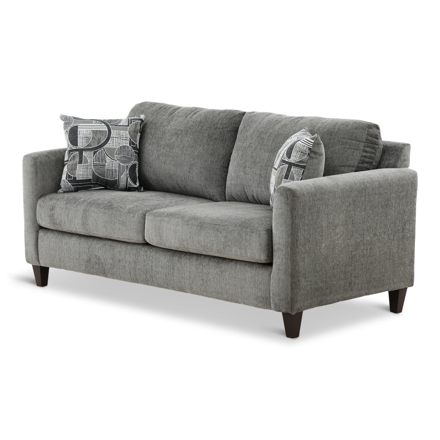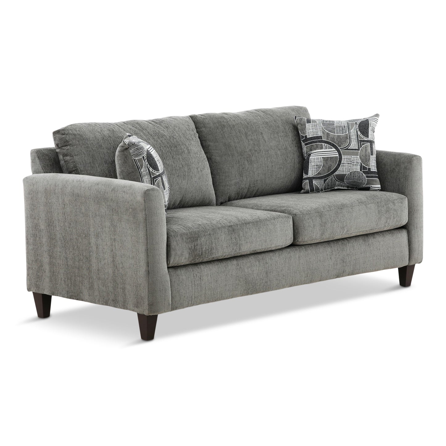 Attractive apartment sized, tuxedo arm, two over two contemporary group with full sized seating. All in a soft, durable charcoal colored chenille with stylish woven jacquard geometric accent pillows on the sofa and loveseat. Matching chair and chaise rocker recliner upholstered in charcoal base cloth.