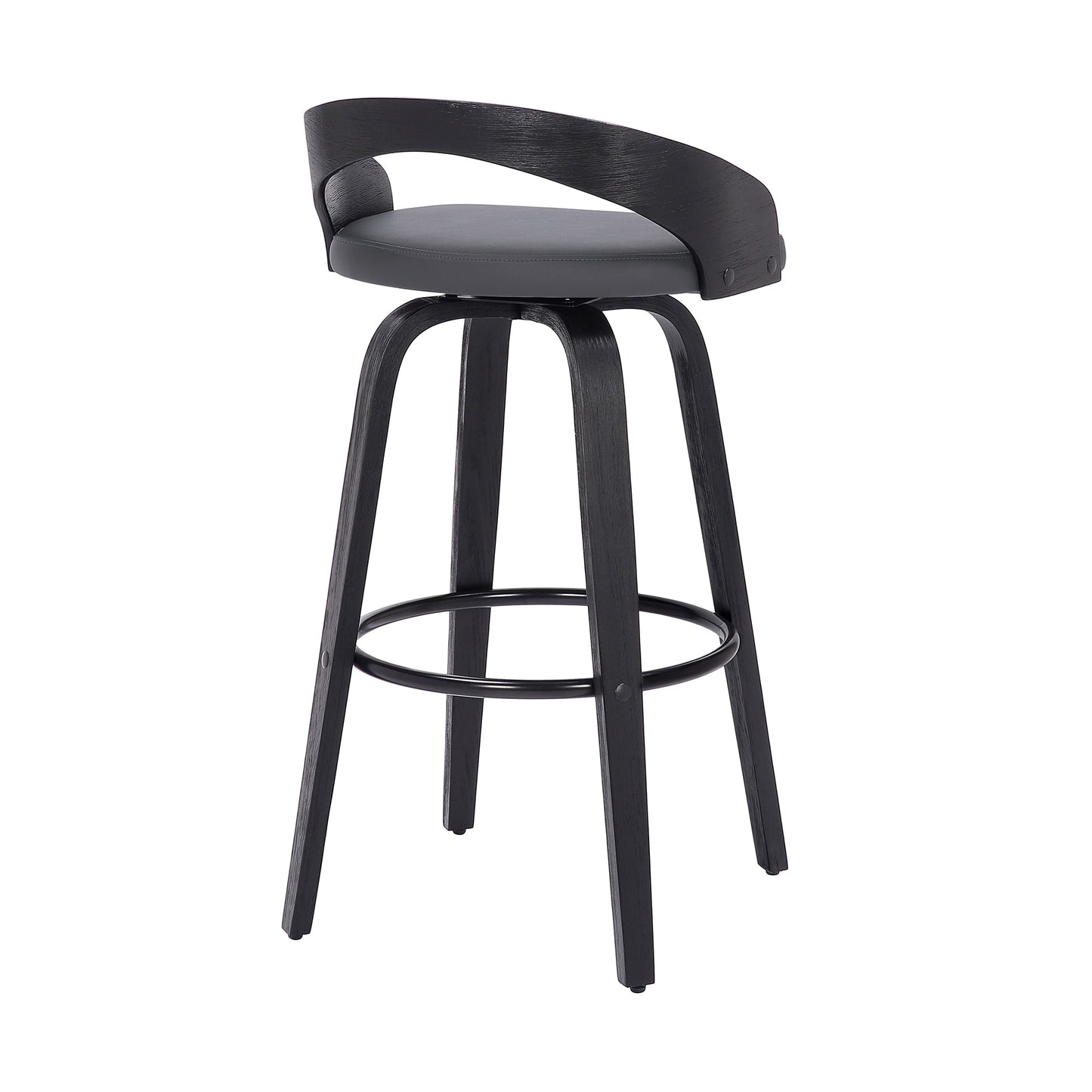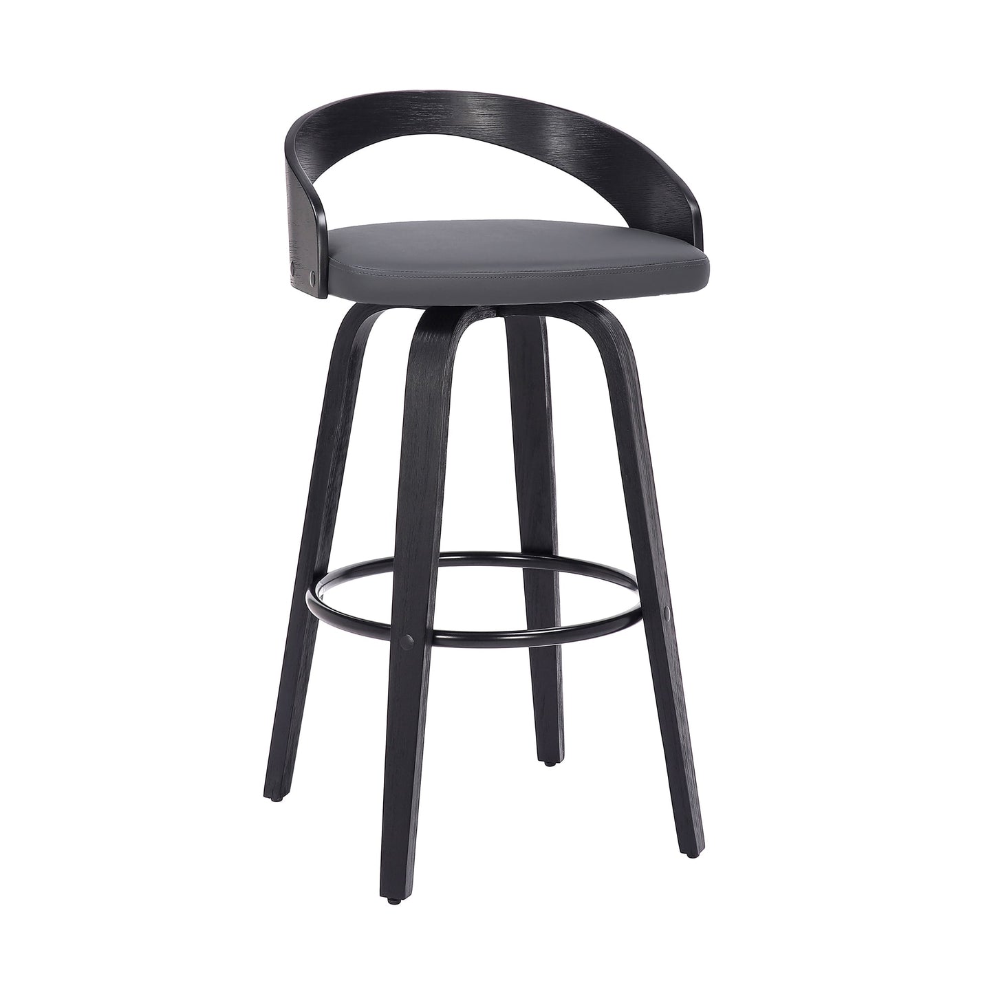 Add a touch of mid-century modern magic to your home with the Armen Living Sonia 26" Swivel Gray Faux Leather and Black Wood Counter Stool. Designed with comfort and style in mind, the Sonia features a 360-degree swivel that allows you to easily interact with your friends and family regardless of their place in the room! The curved wood low back is ideal for posture alignment and an unmatched support, its opening is perfect for breathable easy seating. The Sonia features a high-density foam cushion and beautiful faux leather upholstery that will allow you to sit or entertain for hours on end. The foundation of the product is supported by wood and chrome footrest for a chic and stylish aesthetic without comprising practicality and functionality of this item.