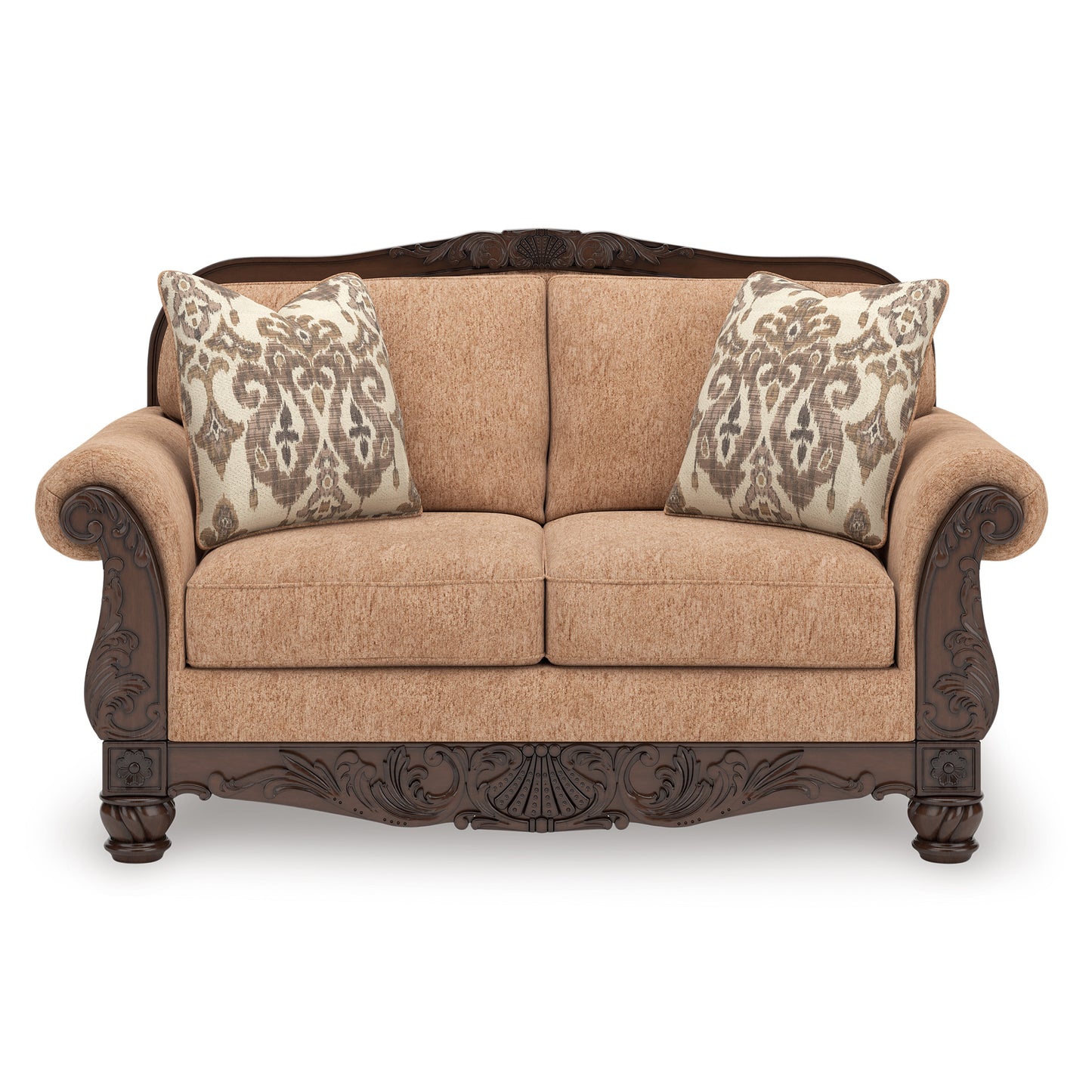 This loveseat is a gorgeous example of new traditional design. Its graceful profile and plush cushions merge classic flair with modern comfort. Golden high-luster textured upholstery sets the tone for an easy elegant look, while carved details and decorative turned legs make a grand statement. Inspired by then, reinvented for the here and now.
