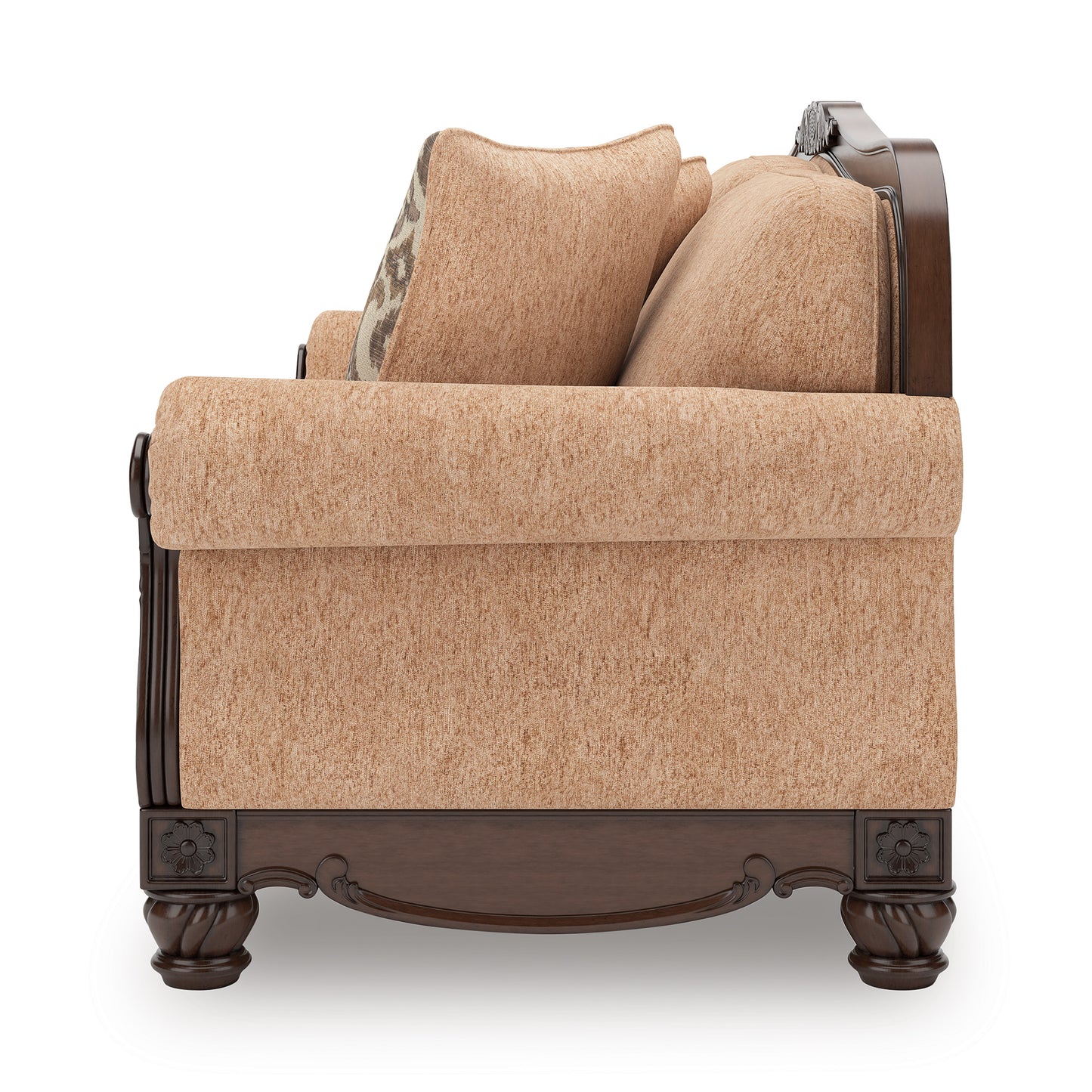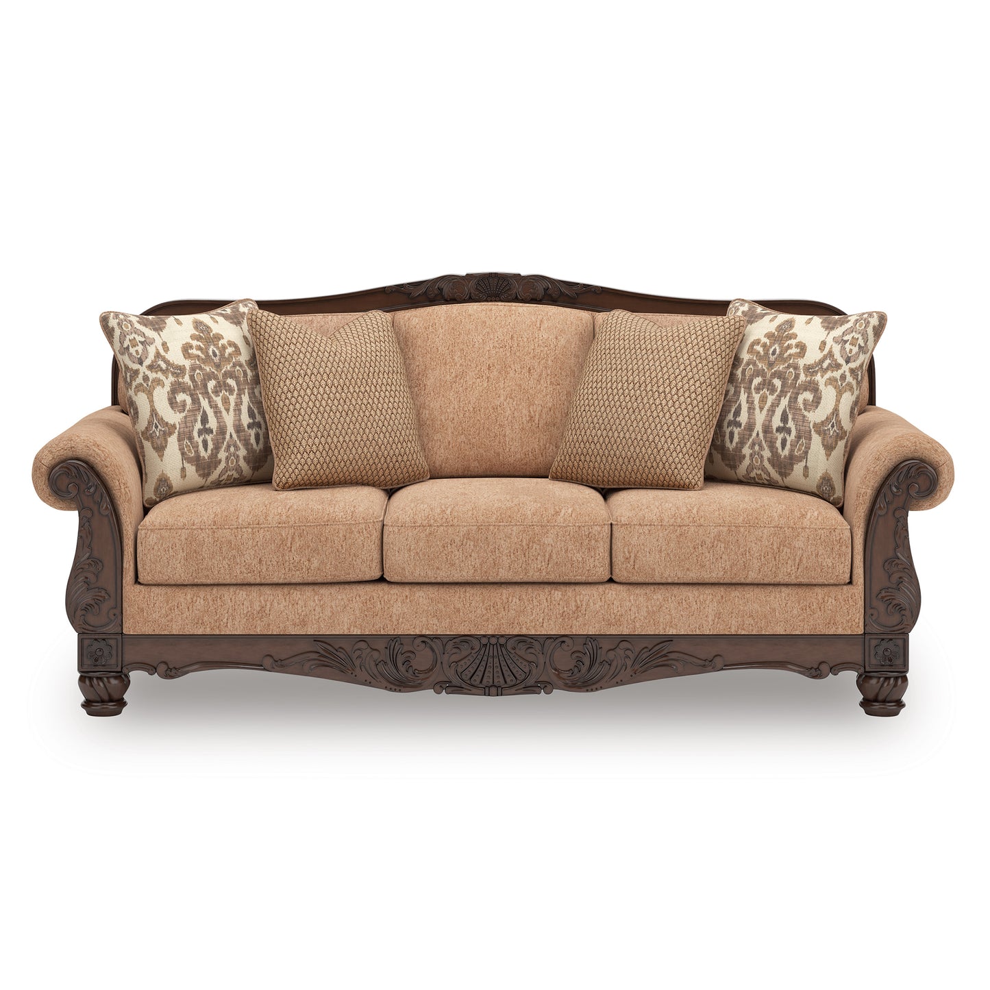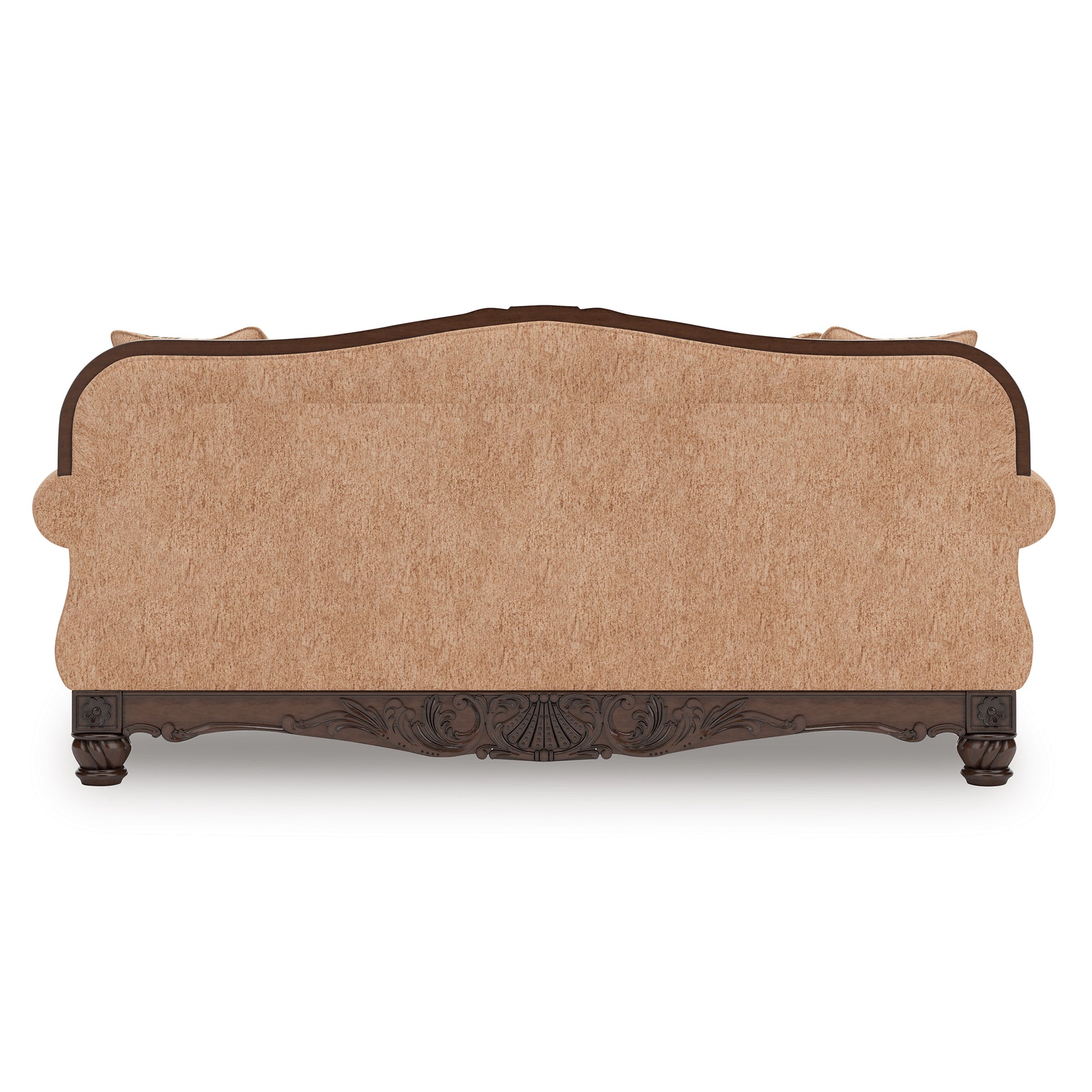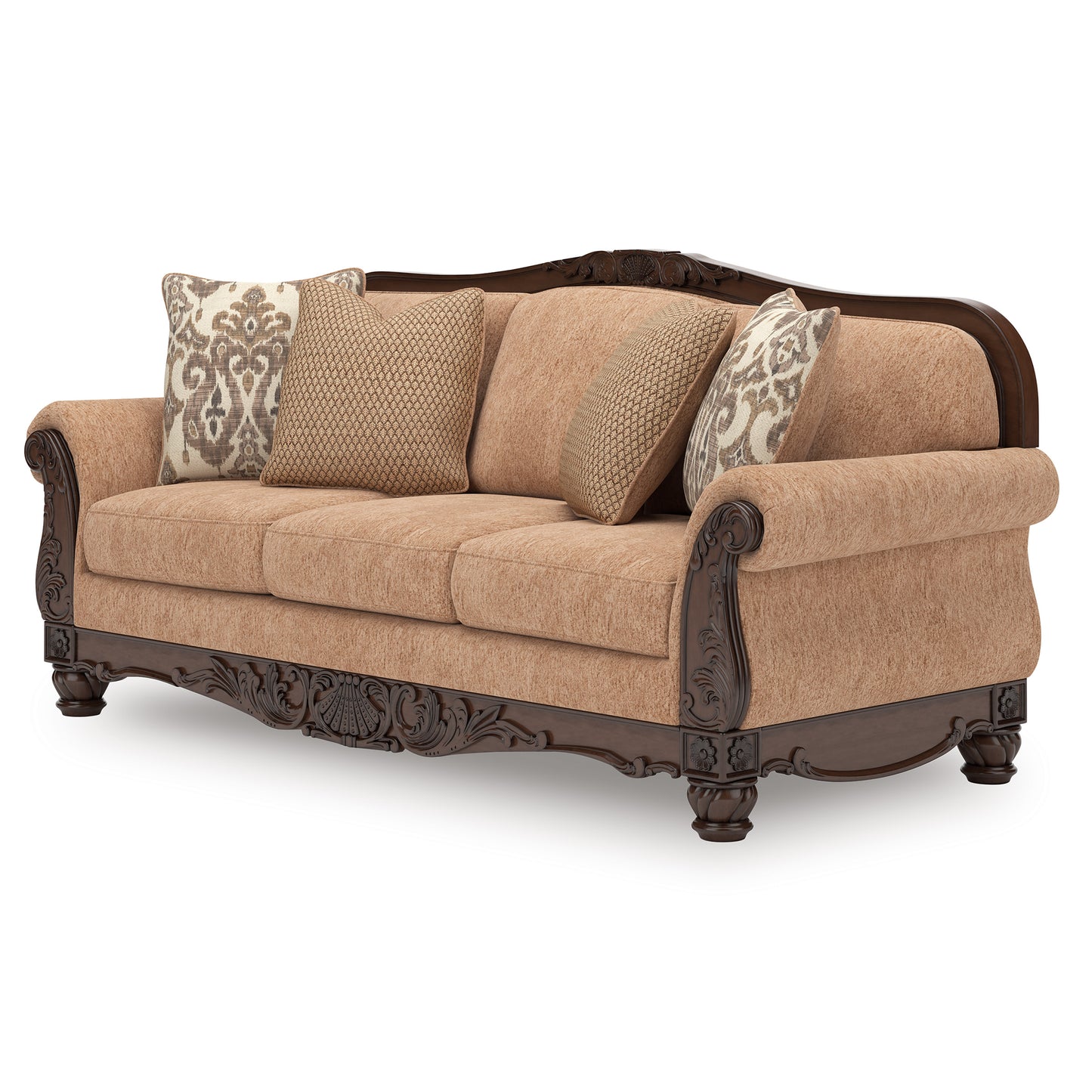 This sofa is a gorgeous example of new traditional design. Its elegant profile and plush cushions merge classic flair with modern comfort. Golden high-luster textured upholstery sets the tone for an easy elegant look, while carved details and decorative turned legs make a grand statement. Inspired by then, reinvented for the here and now.