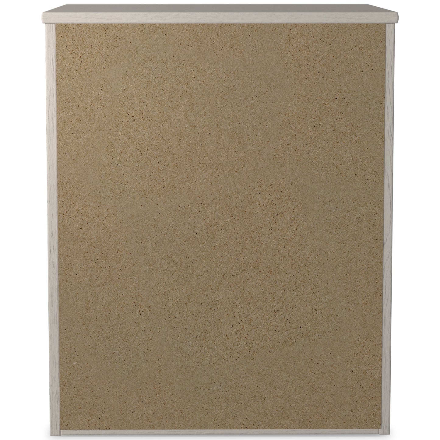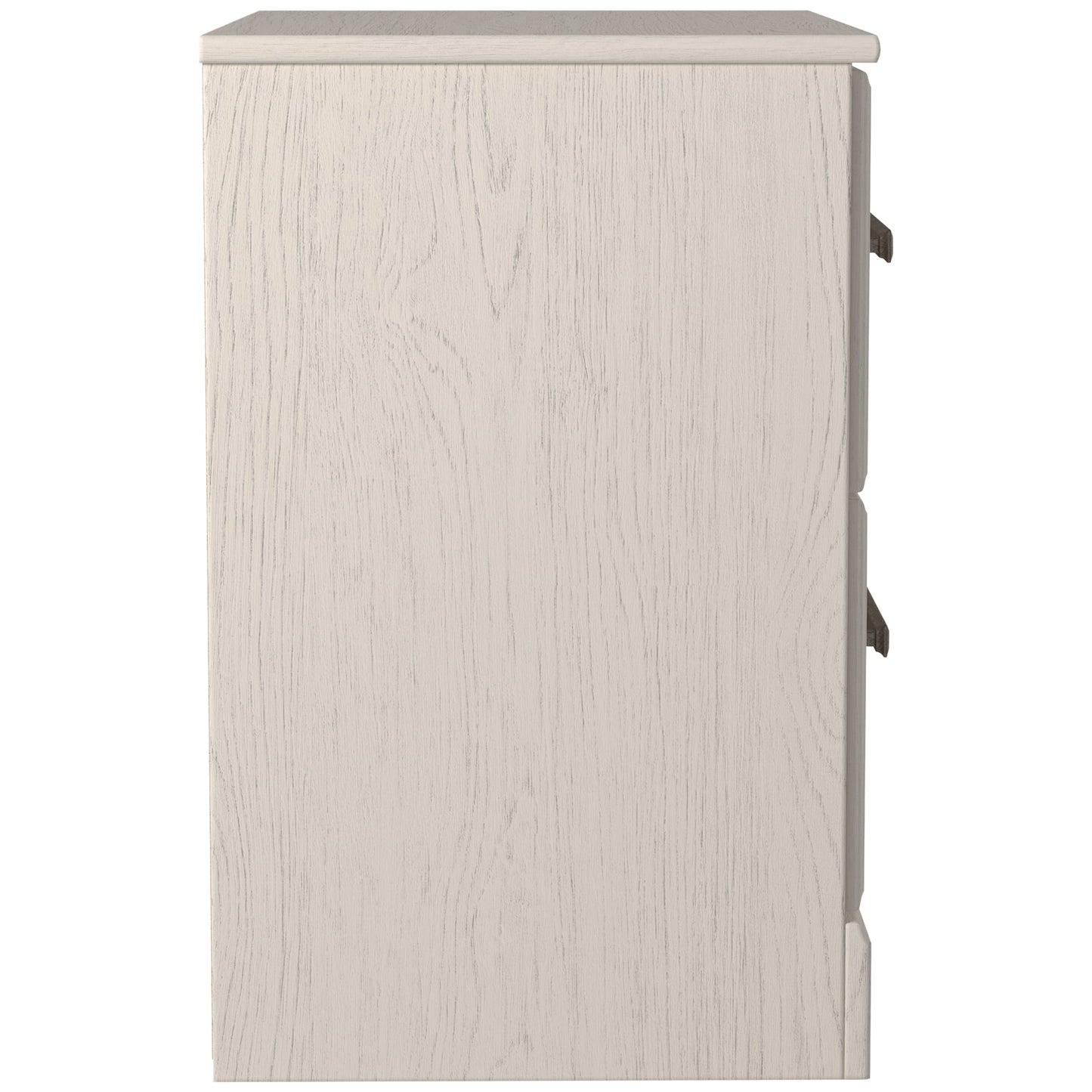 With its clean-lined look and modern attitude, the Stelsie nightstand is a fresh style awakening. Crisp, white hue over subtle replicated wood grain easily complements other furniture finishes. Smooth drawer fronts with antiqued pewter-tone handles completes the aesthetic.