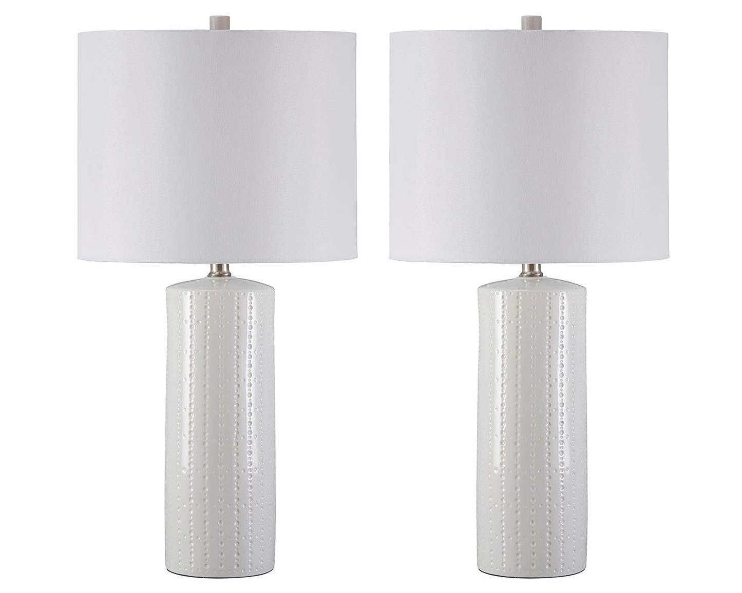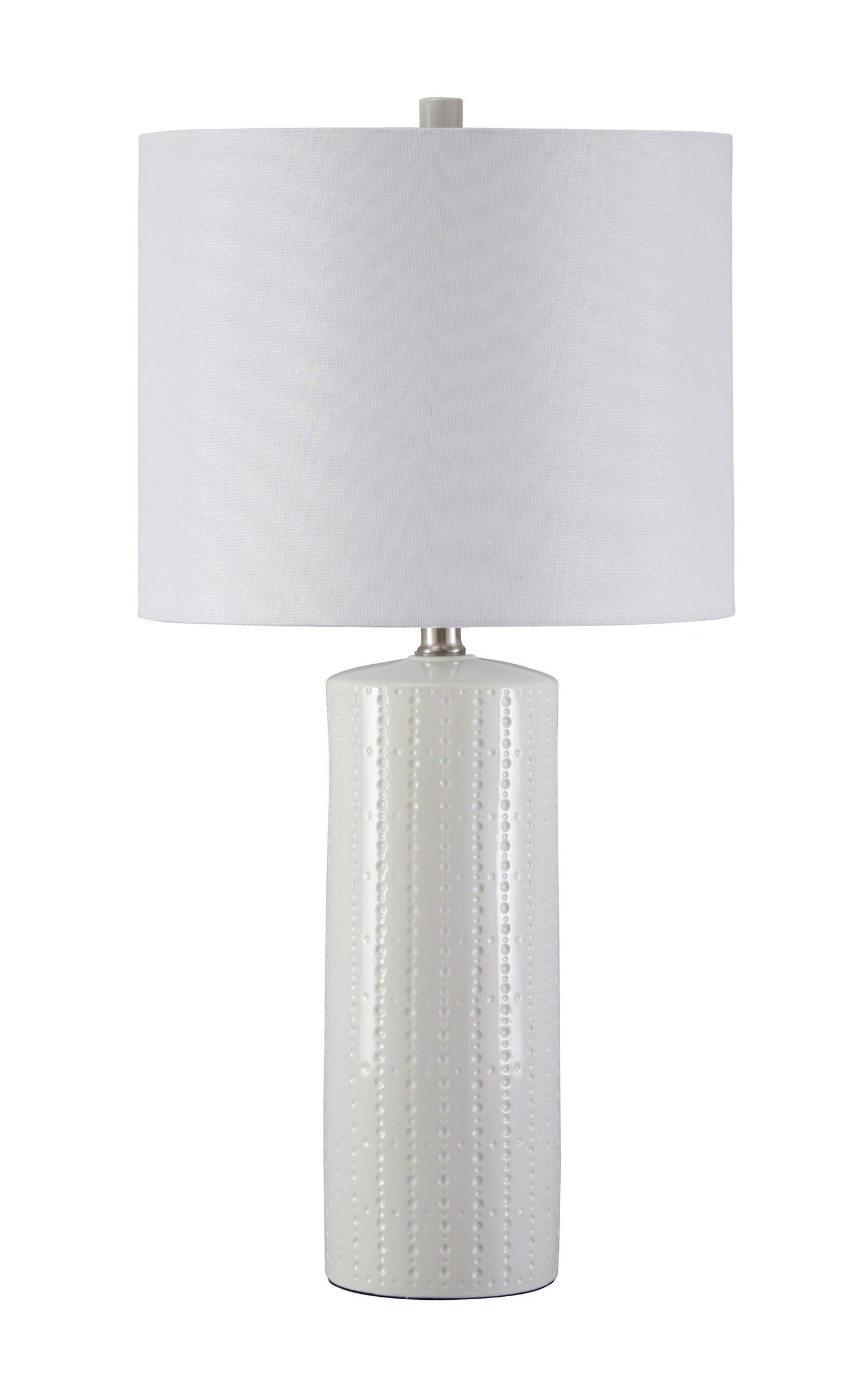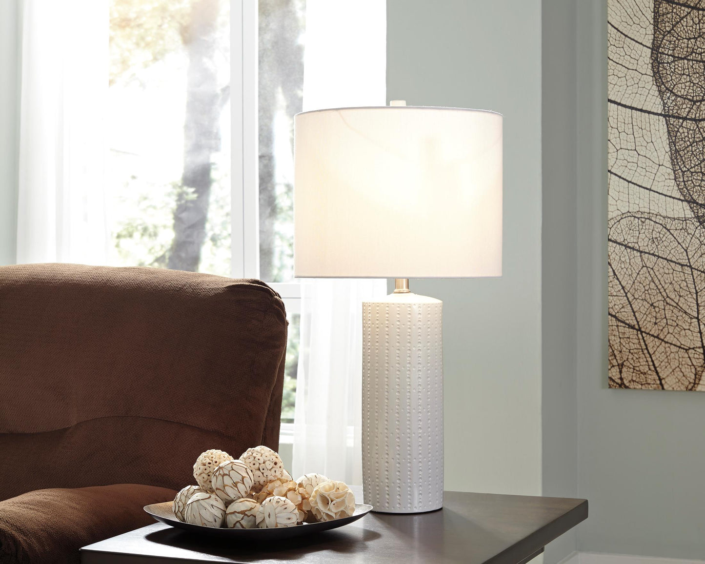 Its base teeming with texture, this ceramic table lamp proves that a monochromatic design can still be visually interesting. Clean lines and a crisp finish are quintessential contemporary.