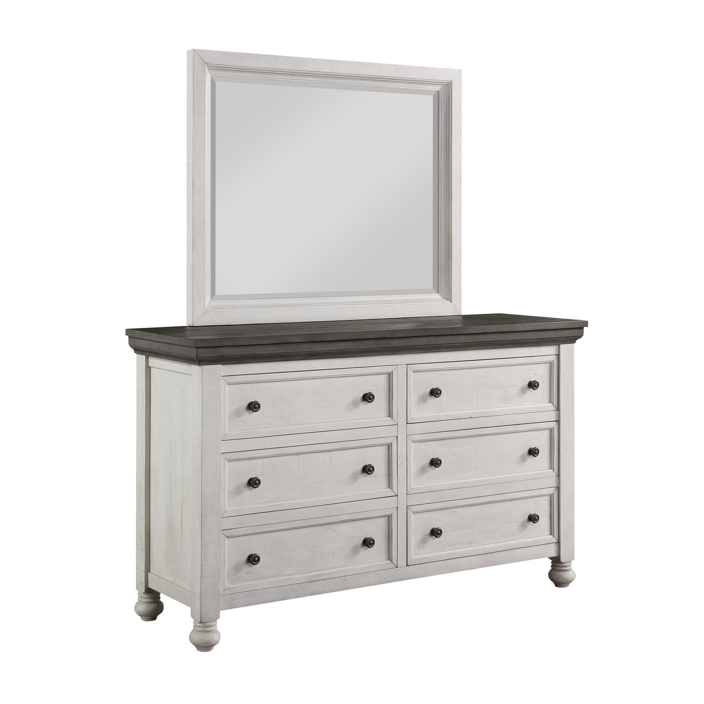 While the design may seem classic, the finish and color combination are current and fresh. The decorative paneling along with the hand turned posts and legs highlight this stunning rustic bedroom made of pine solids and finished in contrasting antique white and light grey. Notice that the turned posts are not over-scaled and allows the multilayered stacked molding of the gray top rails to really stand out.