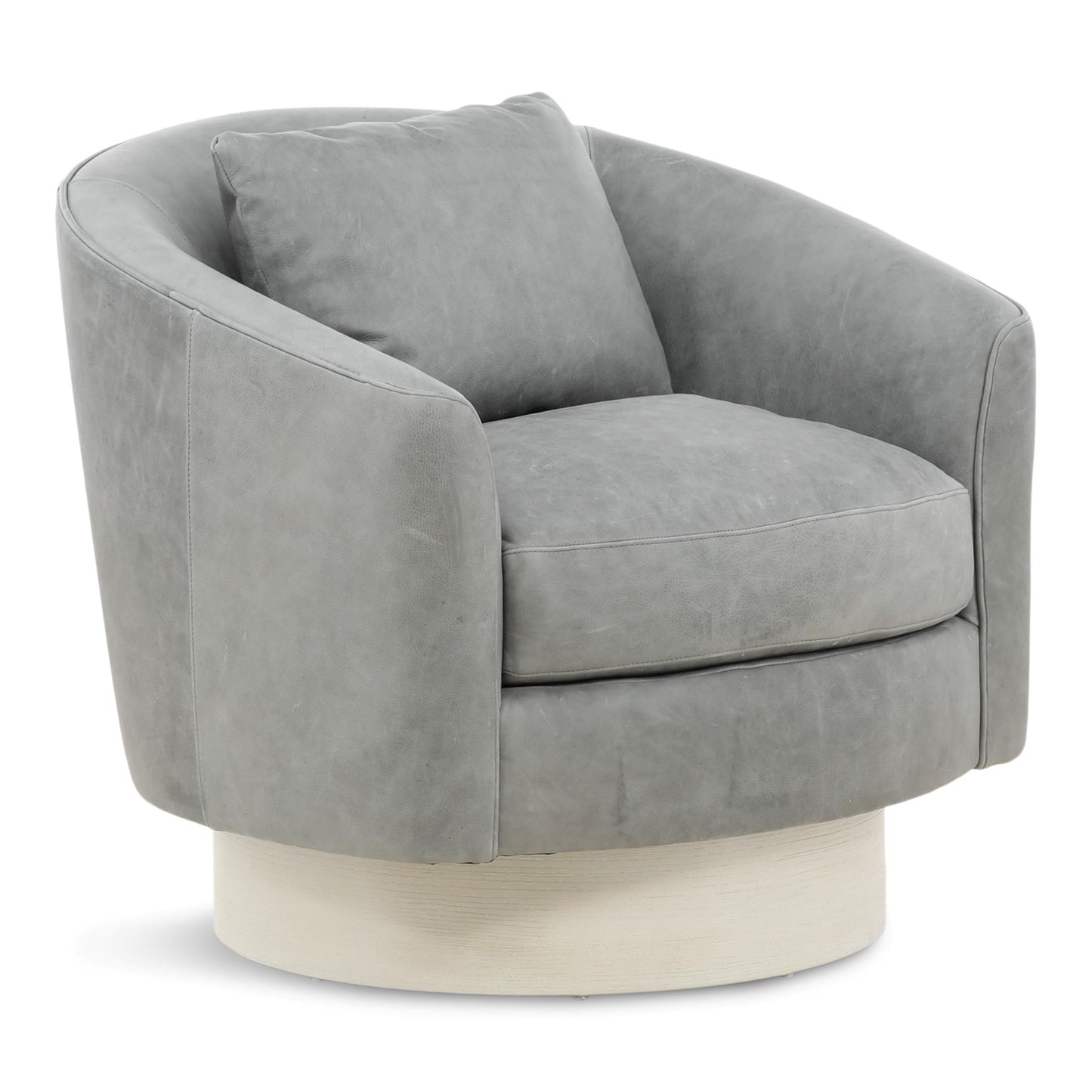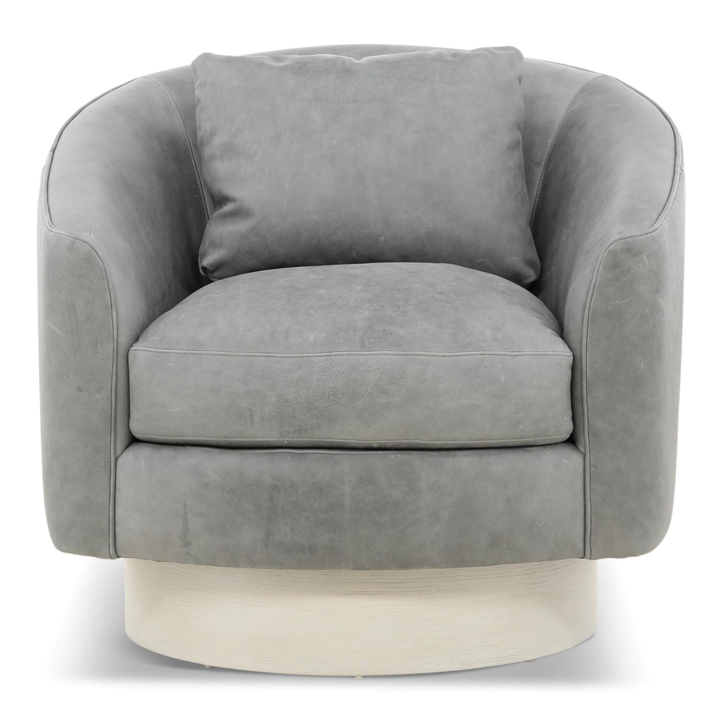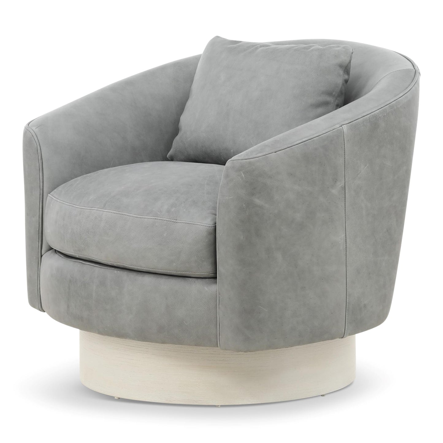 The Camino leather swivel chair is elegance in motion. Luxurious spring down cushioning invites relaxation, while the barrel back design brings softness and balance to a room. In keeping with the clean modern aesthetic, a wide, round wooden base conceals the swivel. Welt trim is a subtle finishing touch.