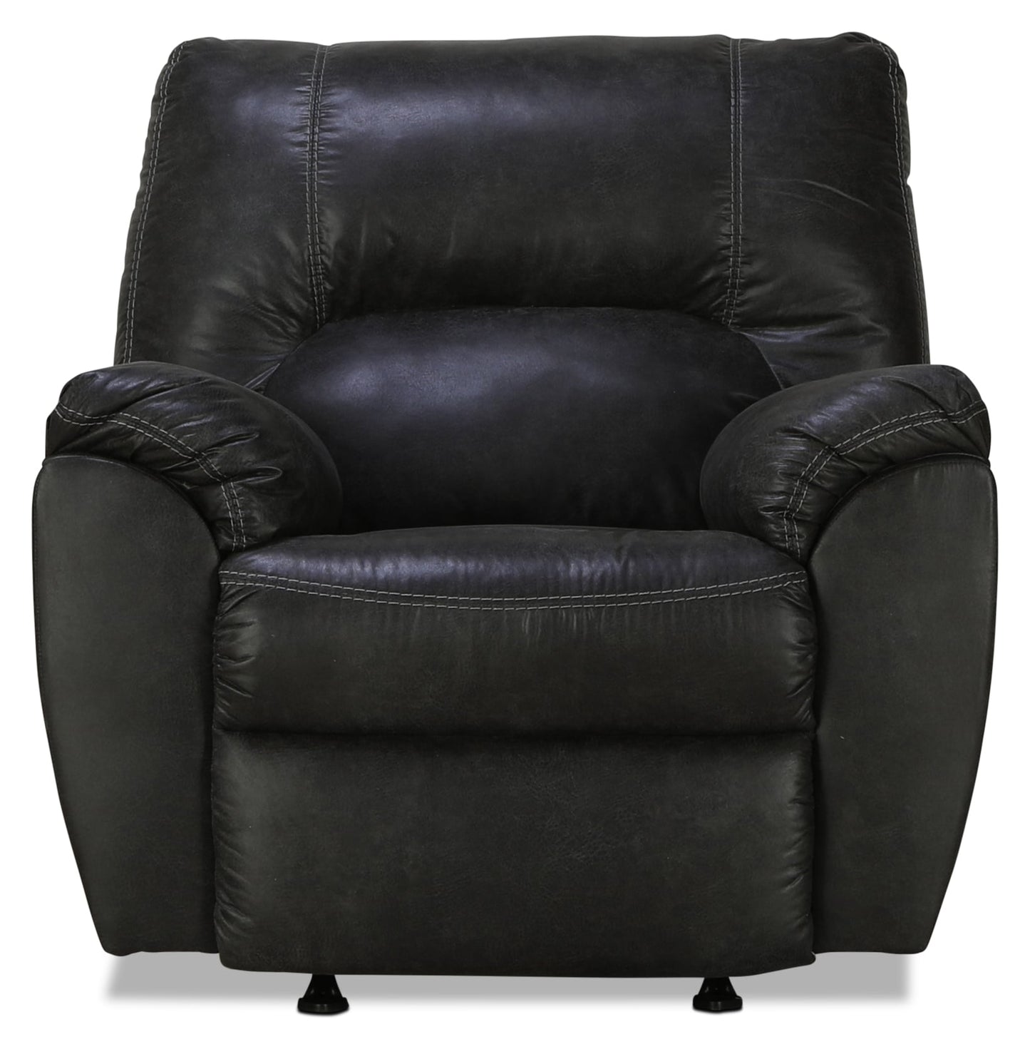 With plush cushions and angled pillow top arms, this rocker recliner takes comfort to a whole new level. Faux vintage leather requires minimal care, making this piece ideal in homes with children and pets. The seat reclines with the pull of a tab, putting total relaxation at your fingertips.