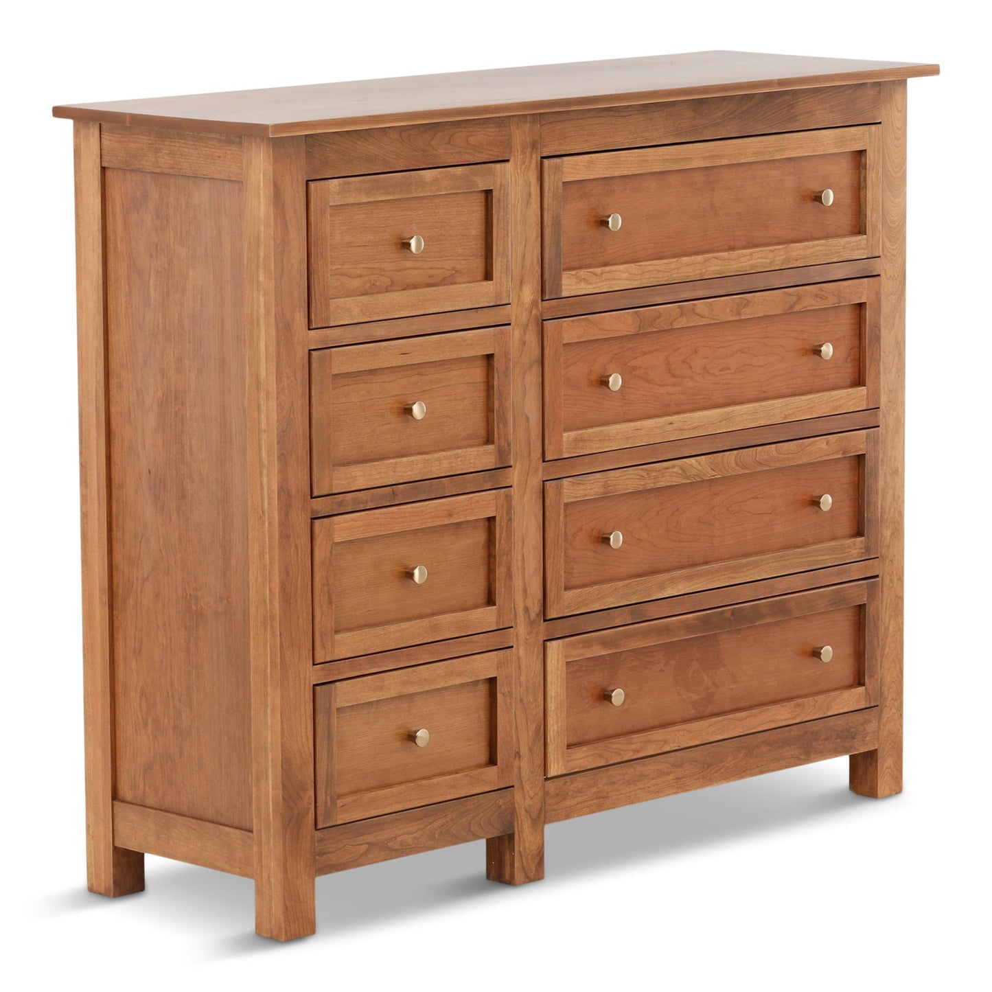The Taylor J collection features solid American Cherry crafted into timeless bedroom pieces with an updated transitional feel perfect for any room setting. The bed is the focal point of any room. Different sized nightstands are also available to ensure the perfect fit and storage needs. Case pieces feature solid baltic pine drawers with English dovetails front and back for long term stability. Smooth working heavy duty side roller guide work quietly and efficiently. The solid cherry wood is finished in a Sherwin William custom cherry brown that is both warm and inviting.