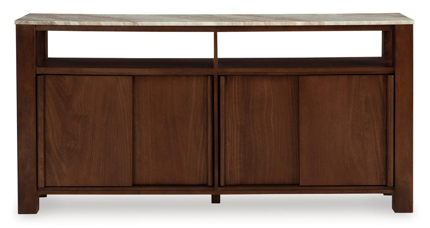 High style and functionality? Check and check. This accent cabinet's taupe, white and gray marble top and contrasting dark brown finish bring the wow factor. Sliding doors open to reveal shelves that are perfect for hiding everyday clutter. Whether you use it for storage or as a TV stand, this showpiece creates contemporary elegance with ease.