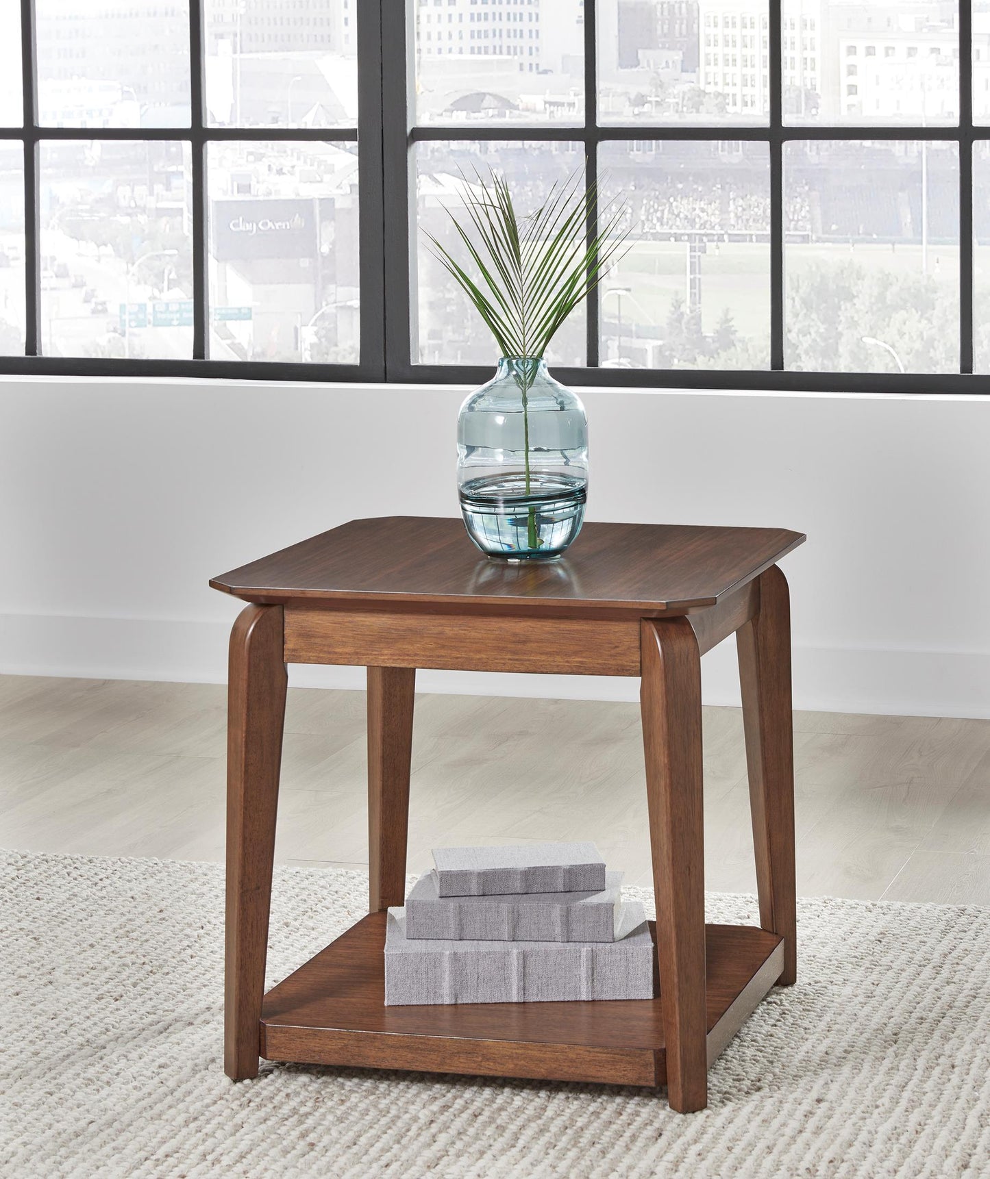 Create retro-inspired character in your living room with this end table. Warm and welcoming in a medium brown, its softly rounded top and tapered legs offer a mid-century appeal well-suited to styles from modern to eclectic. And with a lower shelf for displaying decor, you can enhance this sleekly designed piece with a personal touch.
