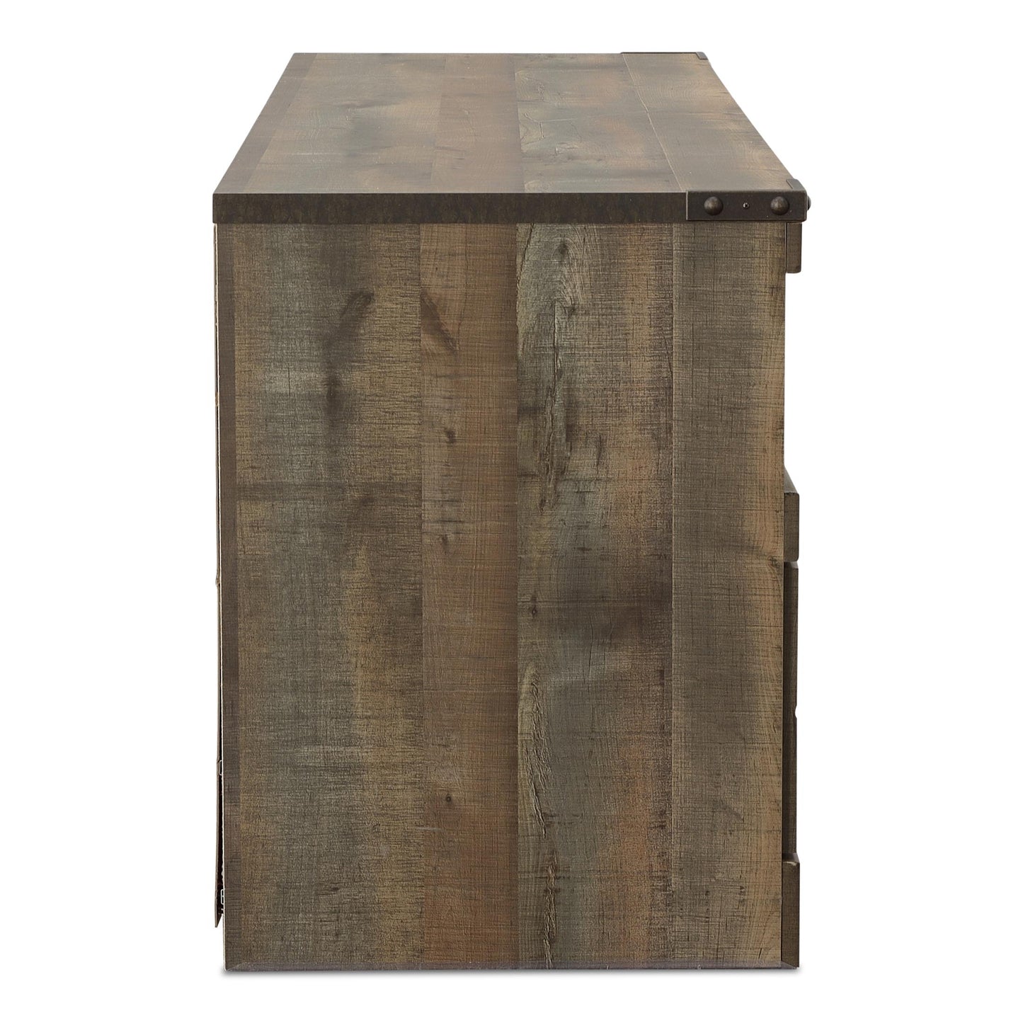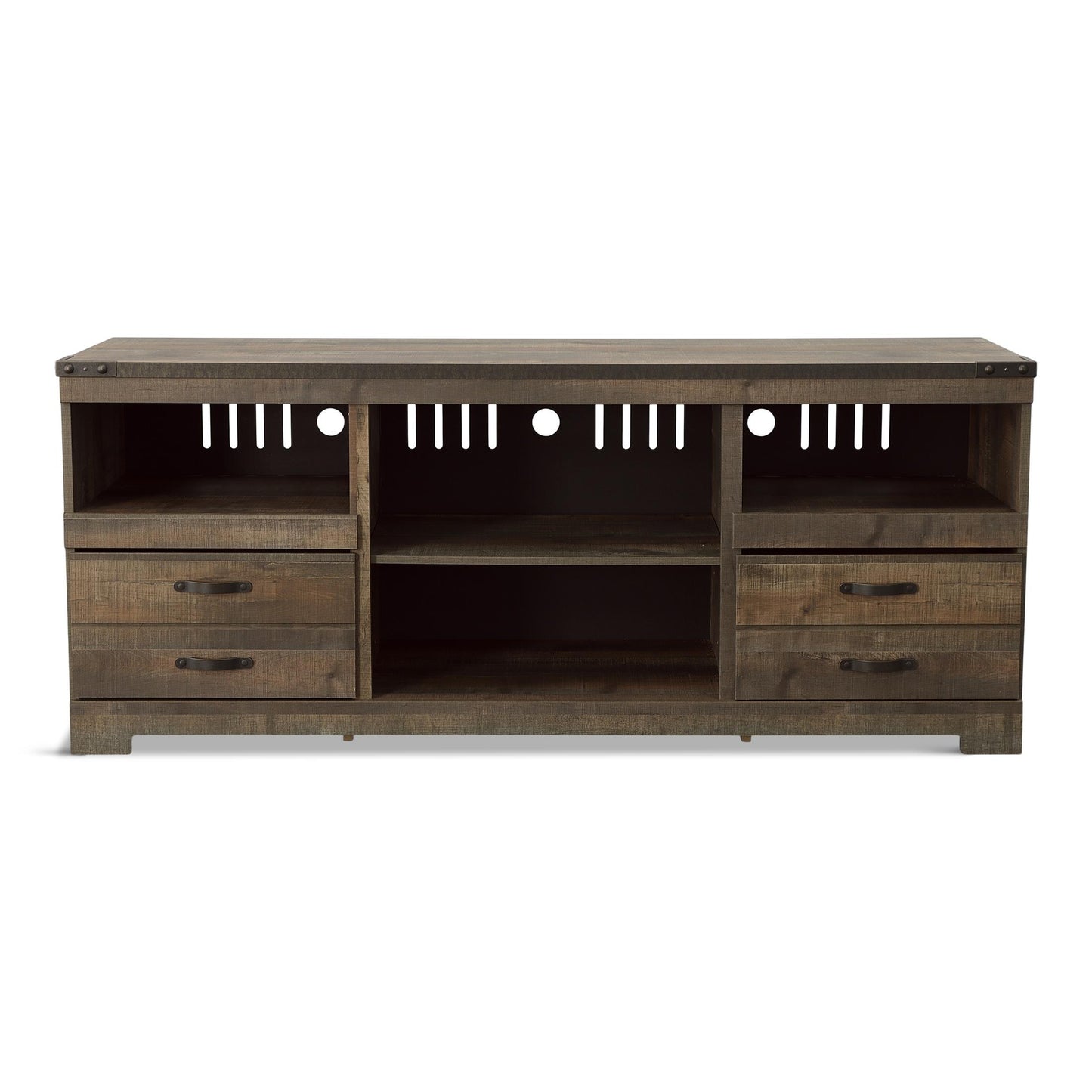 The Trinell TV stand with fireplace option makes your home on the range look so alluring. The aesthetic is earthy yet clean and sophisticated, with a rustic finish, plank-style details and nailhead trim that pay homage to reclaimed barn wood. Removing the shelf allows room the optional electric fireplace for instant warmth and romance.