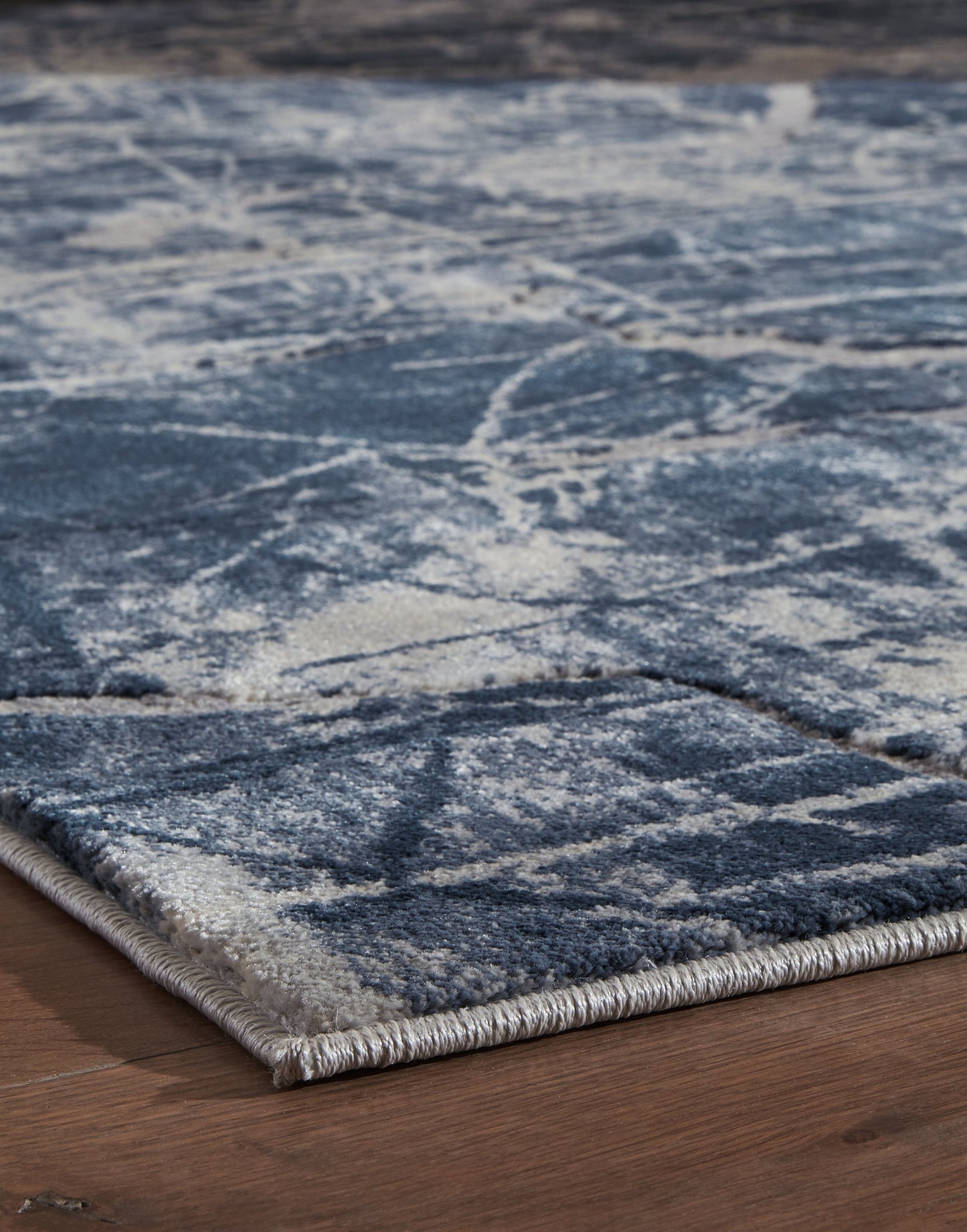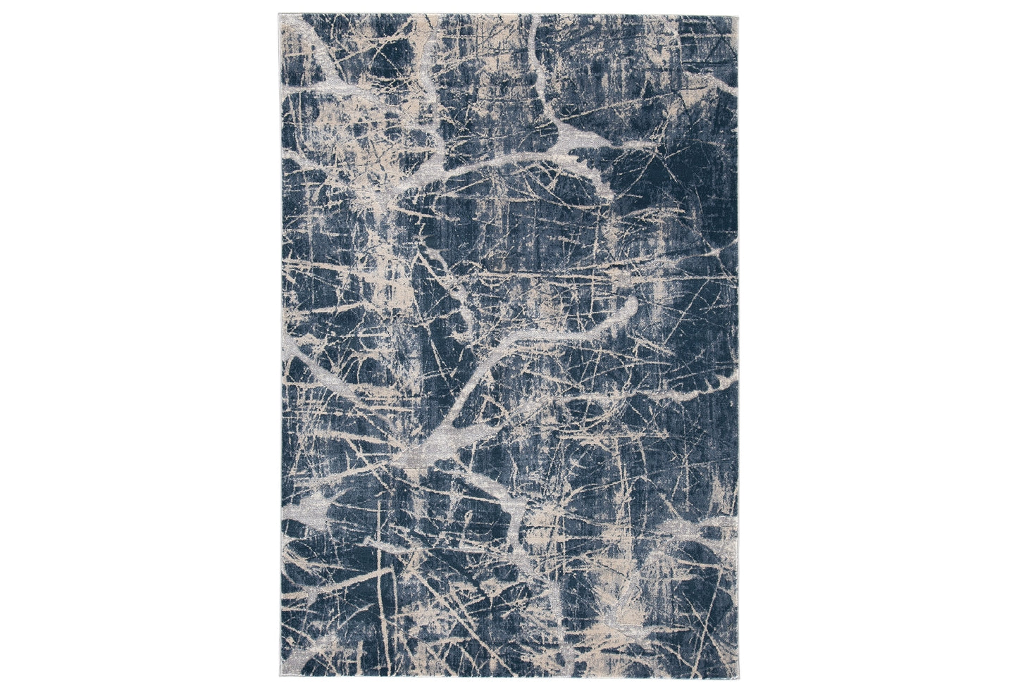 What a mastery in modern style. This designer accent rug sports an abstract marble design sure to appeal to those with an eye for abstract art. Navy, gray and beige palette is earthy elegance at its best.