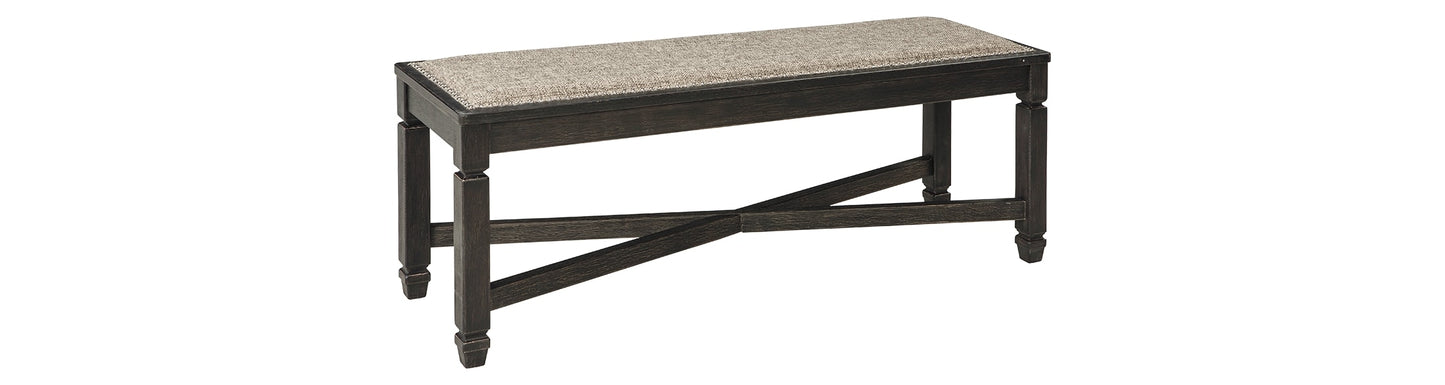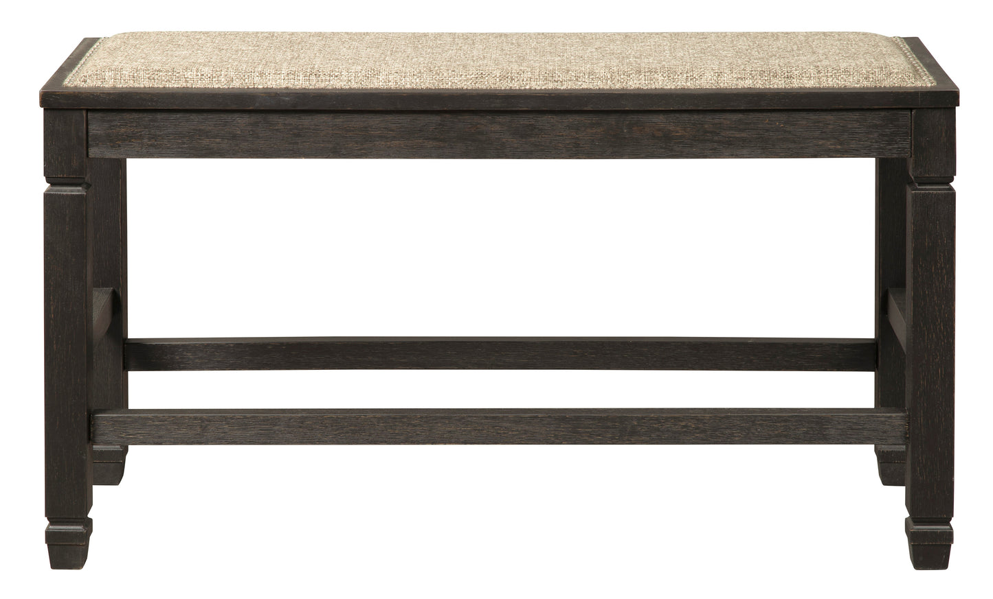 Invite your family into the heart of your home with this upholstered dining room bench. X-shape stretcher and tapered legs are a sturdy foundation. Black finish is beautifully textured. Heavily woven fabric has a quality feel-good touch. Silvertone nailhead trim is decorative without all the fuss. This is trend-right urban farmhouse style.