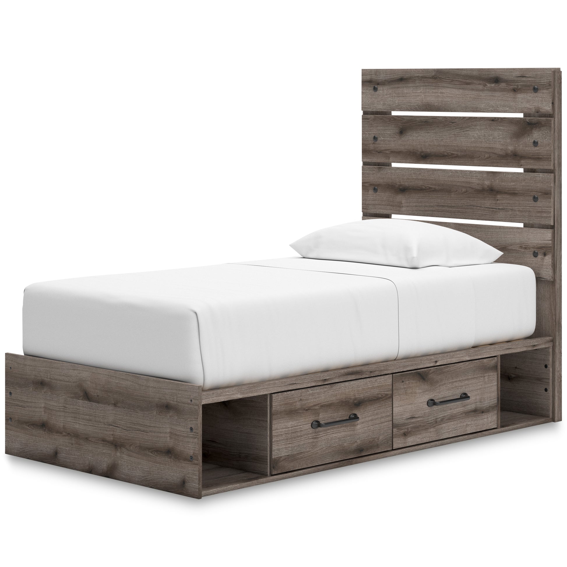 Combining a casual aesthetic with functional flair, this panel bed with storage suits styles from rustic to industrial. Smooth-gliding drawers provide extra space for storing everyday essentials. Dressed in a chic weathered gray hue, this bed brings a charmingly curated vibe to bedtime.