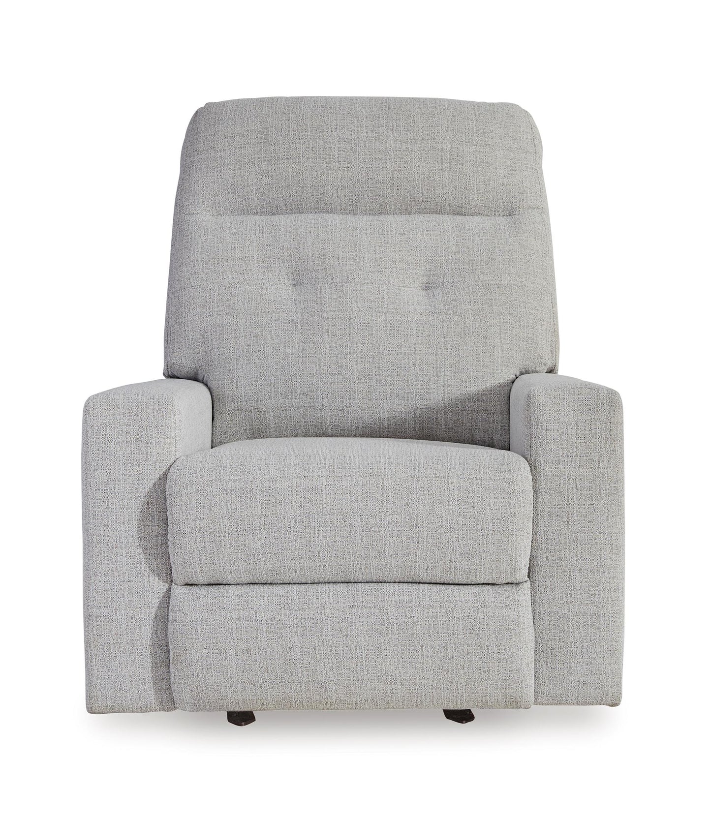 What happens when value meets plush comfort and contemporary design? This rocker recliner is born. Ample cushioning in all the right places makes this the best seat in the house, while updated track arms give a chic modern vibe. Pull tab reclining lets you kick back and unwind with ease. Covered in easy-to-clean Next-Gen Nuvella™ fabric, this recliner is perfect for nurseries and active households.