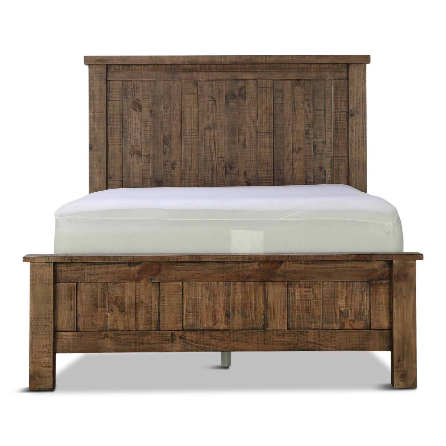 The Valier Bedroom Collection features a light brown, sandalwood finish and is handcrafted with solid pine showcasing the distressed wood. Dark bronze hardware accents this collection perfectly.