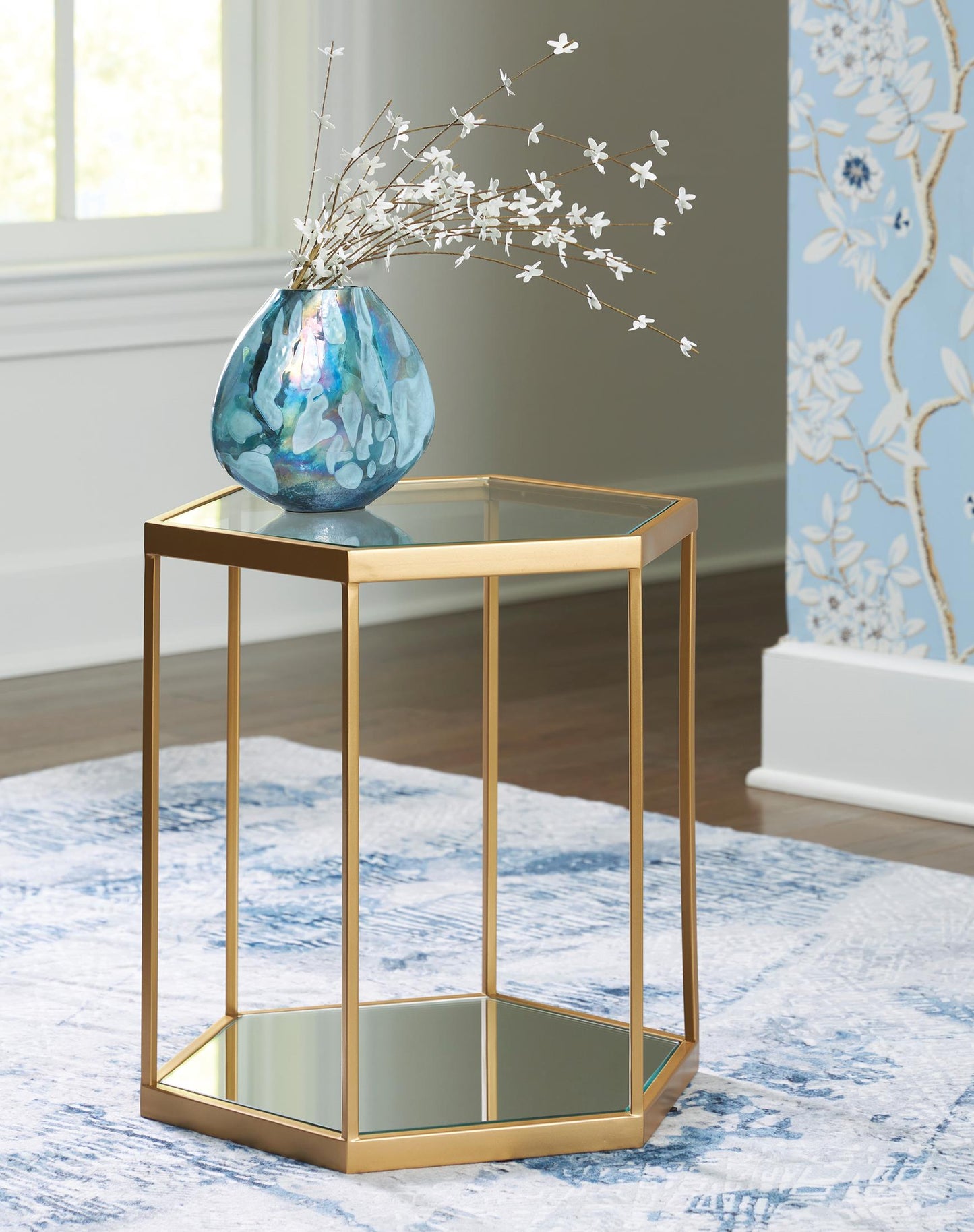 With a sleek goldtone frame accenting glass and mirror insets, this striking accent table combines the very best of modern design. Whether you use it to display decor or hold your favorite drink, the hexagonal design makes it a true standout piece in your cosmopolitan-chic space.