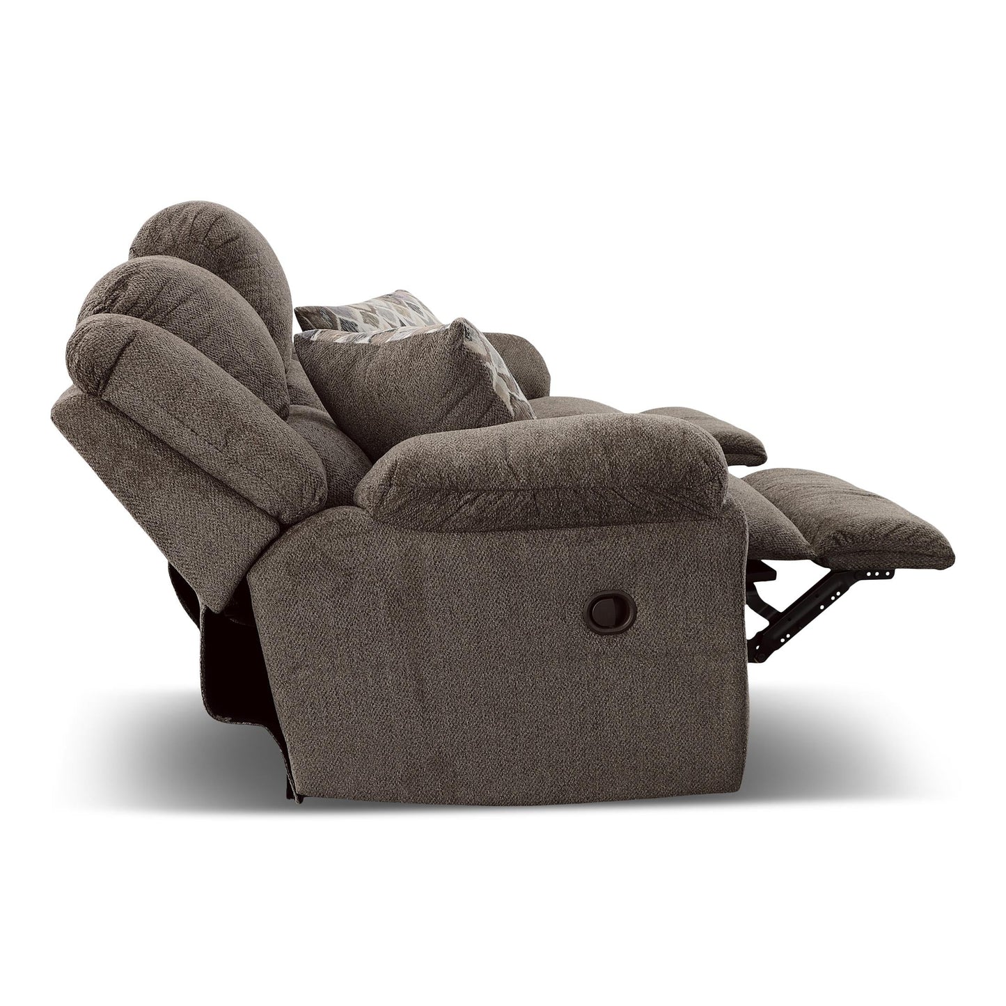 The Venture double reclining sofa features a casual contemporary styling, two correlate pillows and plush, pad-over chaise seating.