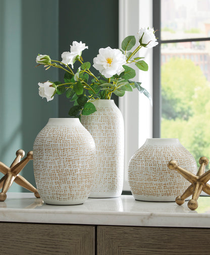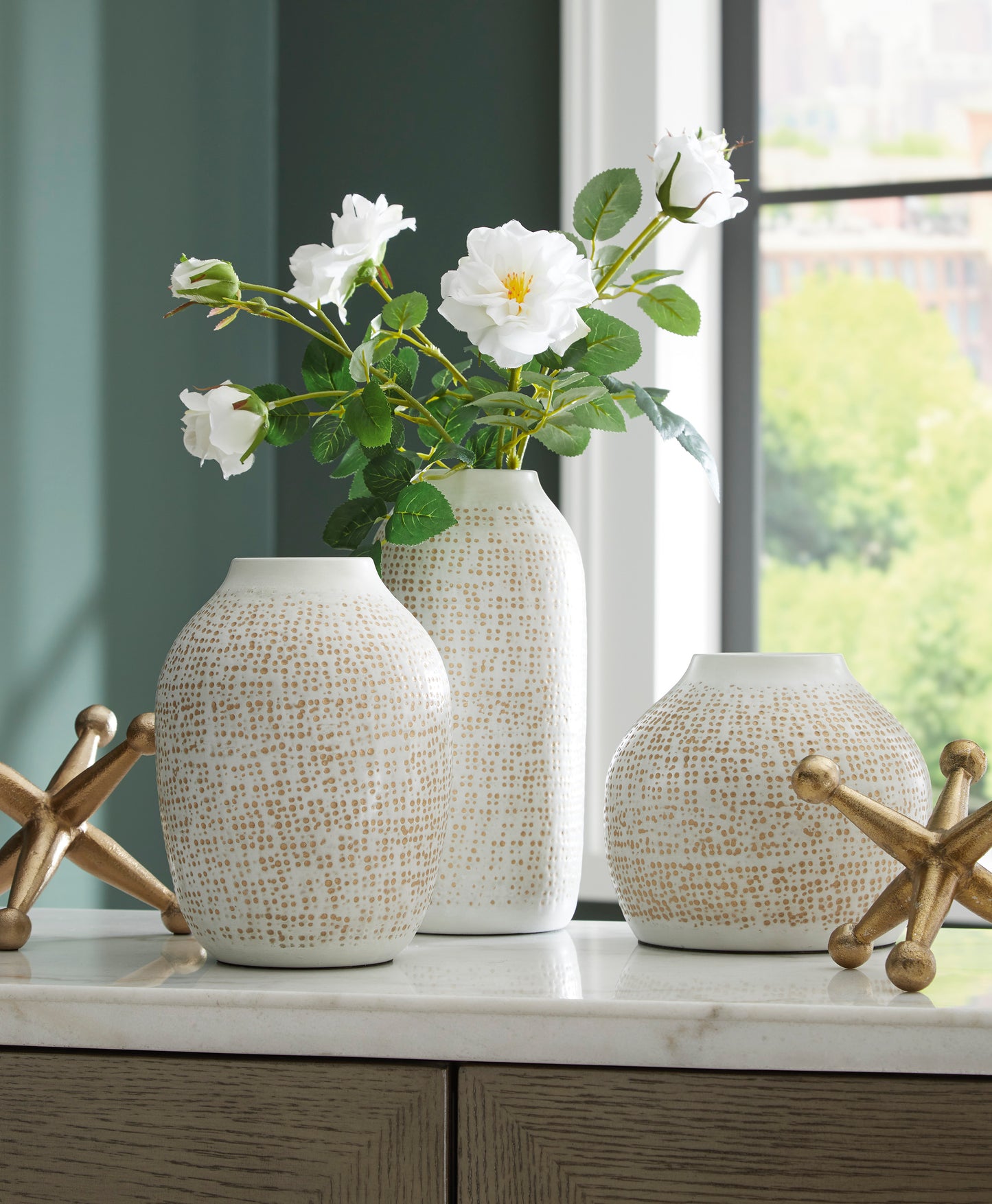 Elevate your decor with this striking accessory set. Its sleek white vases, adorned with delicate goldtone accents, are perfect for displaying your favorite faux blooms or standing alone as minimalist statements. They're paired with bold geometric sculptures, creating a dynamic and sophisticated look for modern spaces.