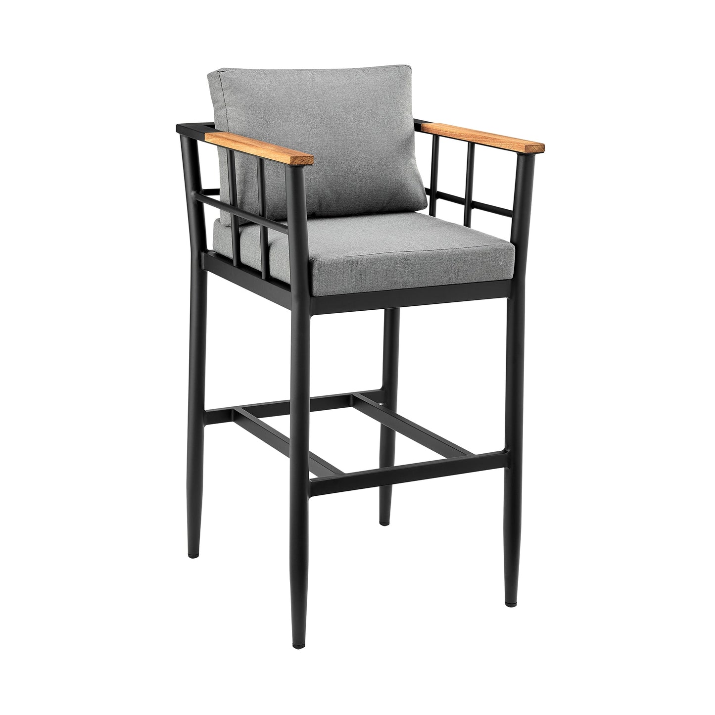 Wiglaf Outdoor Patio Bar Stool in Aluminum and Teak with Gray Cushions