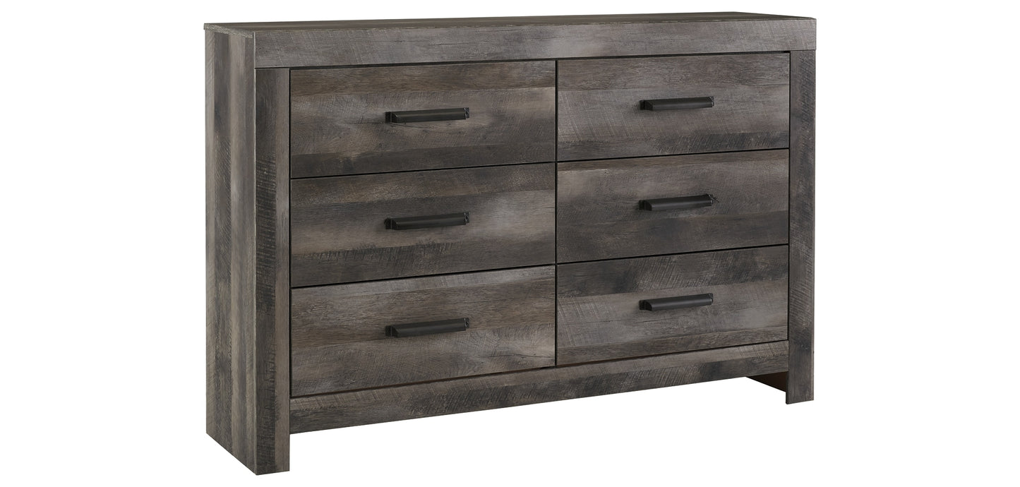 This dresser is sure to win your heart with its daring, designer take on modern rustic style. The dresser's crisp, clean and minimalist-chic profile is enriched with planked replicated oak grain, treated to a weathered gray finish for that much more authentic character. Large-scale hooded pulls gracing the flush-mount drawers add such a distinctive twist.