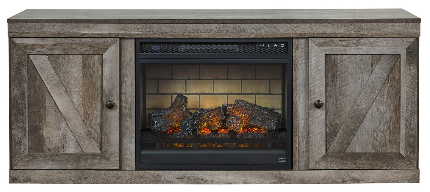 This TV stand is sure to win your heart with its daring take on country living. Its crisp, clean minimalist-chic profile is enriched with a gray finish, striking replicated oak grain and thick plank styling for that much more authentic character. Crossbuck detailing adds a brilliant barn door-inspired touch. Opt for the optional fireplace insert (sold separately) for added warmth.