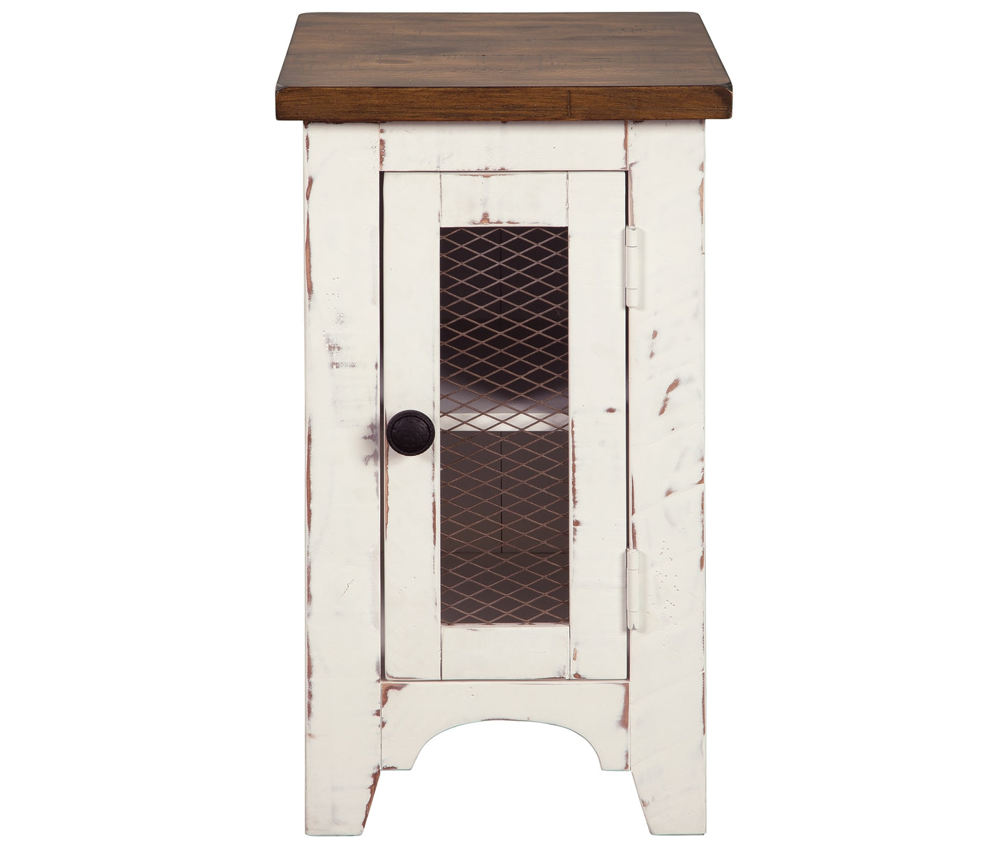 Double take. Sporting a two-tone finish that pairs a distressed vintage white with aged natural pine color, this chairside end table elevates the art of rustic farmhouse living. Enhancing its charm: shelved storage visible through the cabinet door with inset metal grill.